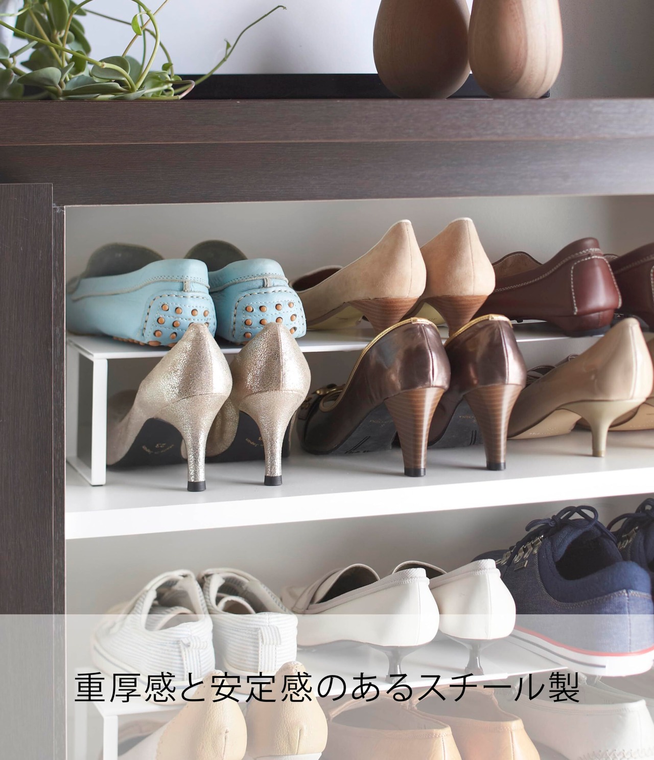 下駄箱の中の収納力を倍にする伸縮シューズラック! 伸縮できるから下駄箱のサイズに合わせて調整も自由自在! より ●下駄箱の中の収納力を倍にする伸縮シューズラック! 伸縮できるから下駄箱のサイズに 合わせて調整も自由自在!