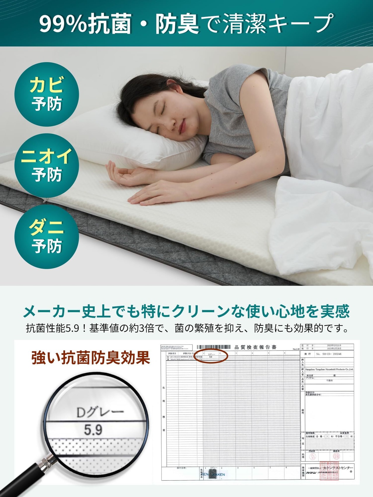 【抗菌防臭防ダニ】抗菌防臭加工付きで、菌の繁殖を抑え、寝具をいつも清潔に保つことができます。夏のジメジメのニオイや寝汗による体臭、加齢臭などをお使いの寝具から吸収して、イヤなニオイを減少してくれます。