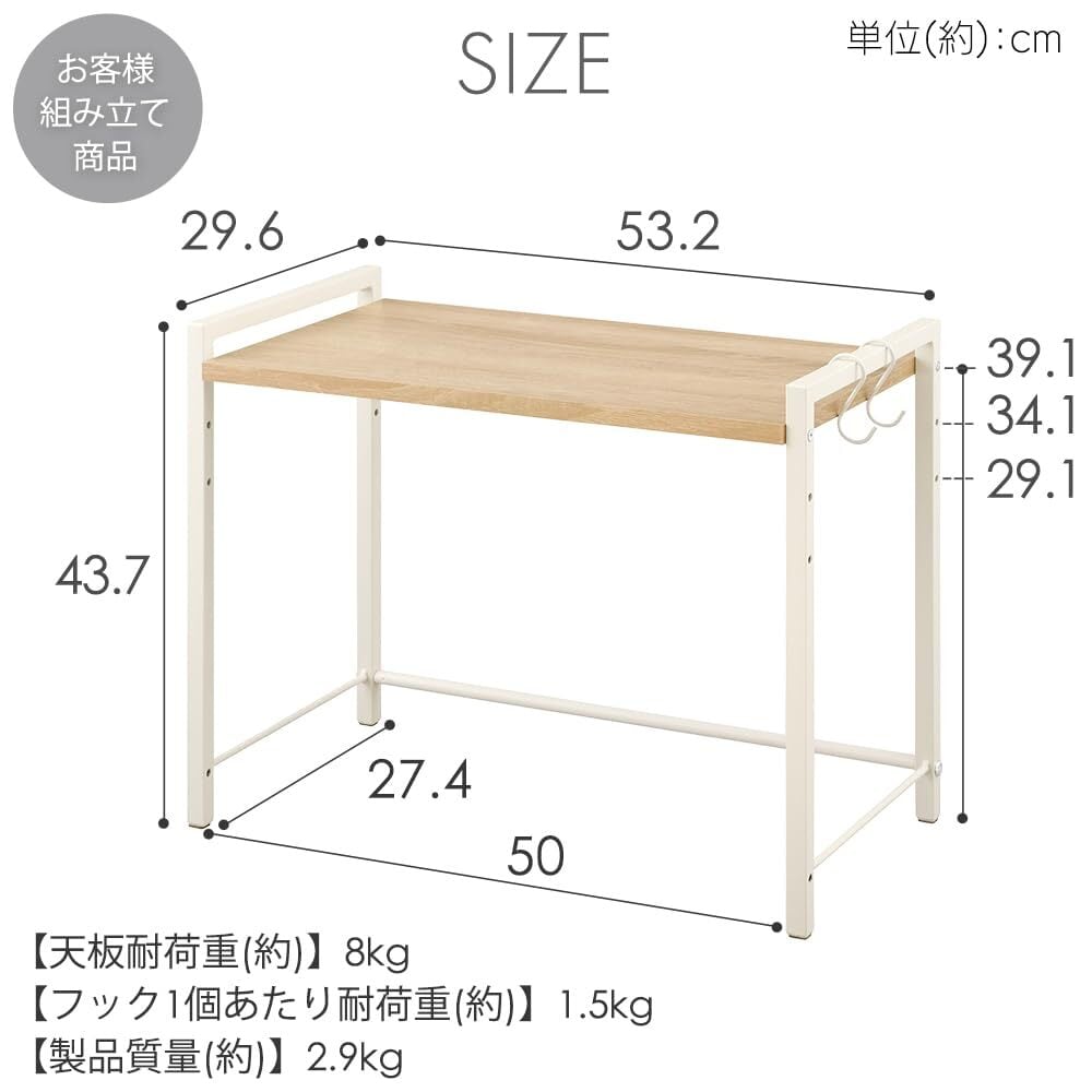 商品詳細:【天板耐荷重(約)】8kg【フック1個あたり耐荷重(約)】1.5kg【製品質量(約)】2.9kg【お客様組み立て品】必要工具:プラスドライバー(サイズ:2番) ※電動ドライバー使用可能です。※インパクトドライバーは使用不可(破損するおそれがあります)
