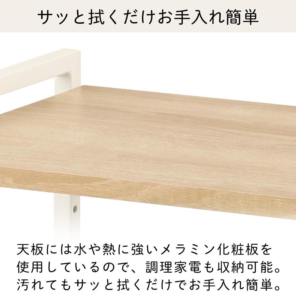 天板耐荷重は最大伸縮時約8kgとしっかりした丈夫なつくりです!調味料のボトルや調理器具、調理家電などもまとめて収納できます。水や熱に強くお手入れが簡単!天板には水や熱に強いメラミン化粧板を使用しているので、調理家電も収納可能です。また、汚れてもサッと拭くだけだから、お手入れラクラク。