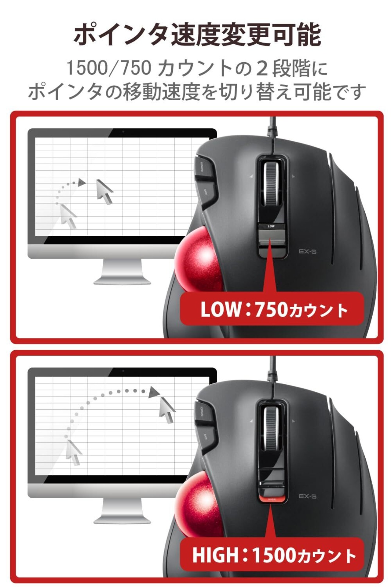 ポインタの移動速度を1500/750カウントの2段階に切り替えできる速度変更スイッチが付いています。