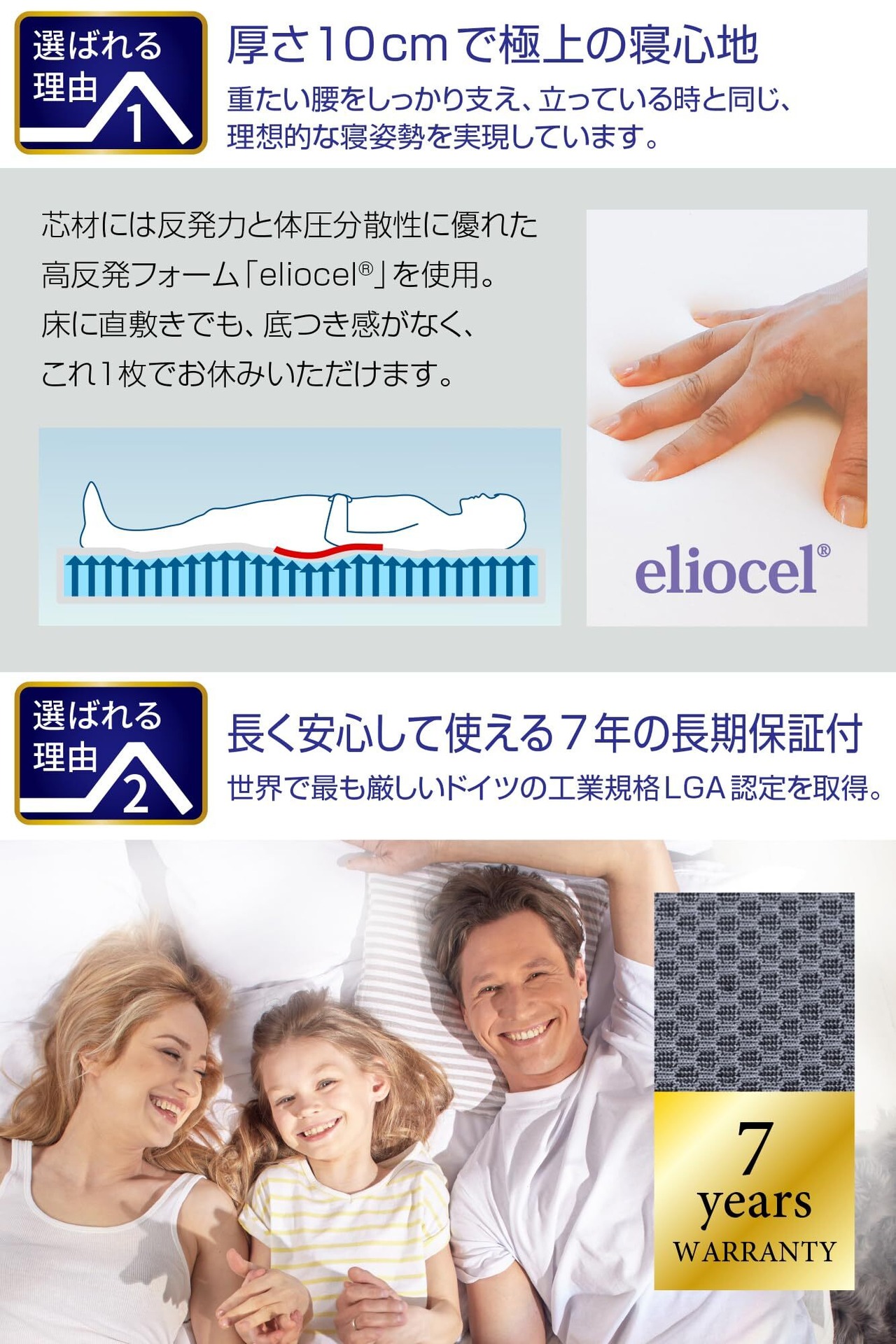 理想の寝姿勢と言われる、立っている時と同じ姿勢と優れた体圧分散を実現する、硬め好きの方から人気のベーシックモデル。「しっかりとした硬めの寝心地」と高い耐久性が特長の高密度高反発フォームエリオセル採用。重たい腰をしっかり支え上げます。