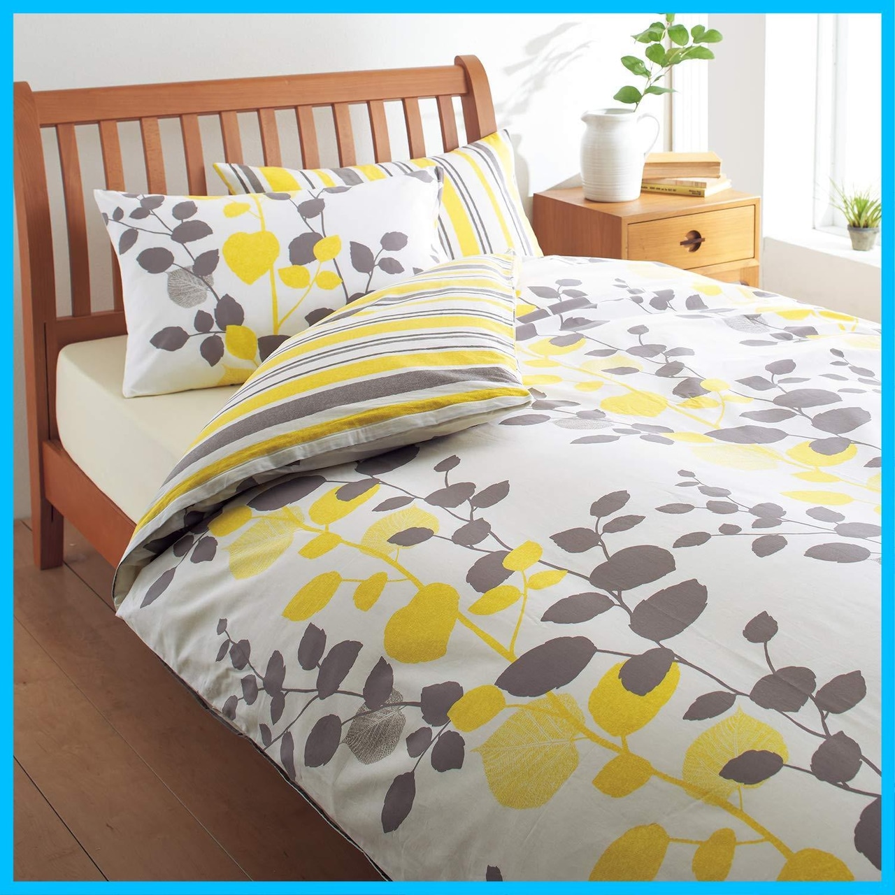 ボタニカル風のリーフとストライプが表裏でデザインされたカバーです。お好みに合わせてリバーシブルで使えます。