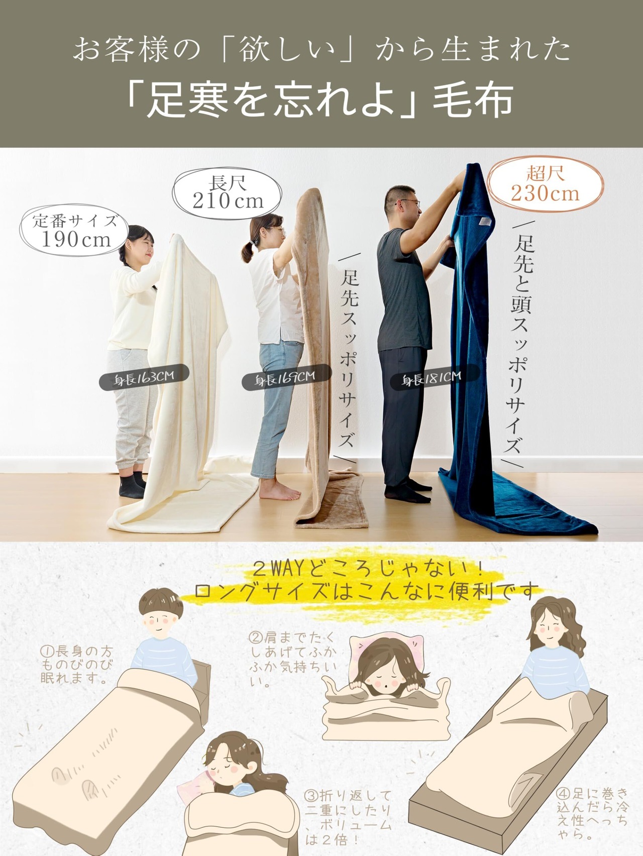 【ロング毛布&2WAYどころじゃない!】 弊社の暖かい毛布は通常サイズよりも約40cm大きいロングサイズで、さまざまな使い方が可能です。➡ ①長身の男性でものびのび眠れます。➡ ②肩までたくし上げて、ふかふかの心地よさを楽しめます。➡ ③襟元を折り返して二重にしたり、ボリュームが2倍になります。➡ ④足元に巻き込んで冷え性対策にも最適です。➡ ⑤つま先から頭まで全身を覆うことができます。 特に冷えやすい足元や肩もしっかりと包んでくれるので、さまざまな使い方でより暖かくお休みいただけます。