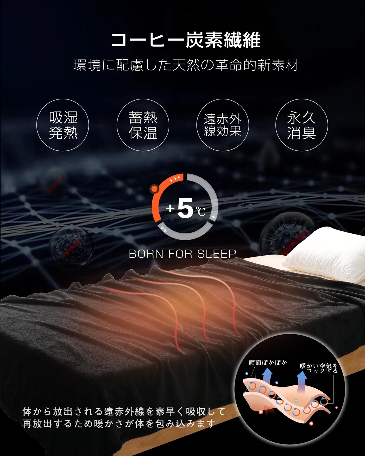 【天然の発熱・蓄熱新素材】地球資源の枯渇が叫ばれる中、持続可能な未来を築くためには、環境に配慮した素材の開発が欠かせません。そこで、私たちは生活の知恵から生まれた「エココーヒー繊維」を採用しました。この素材は、優れた消臭・脱臭効果、発熱・蓄熱効果、遠赤外線効果を持ち、さらに速乾性にも優れています。この新素材がもたらす優しい温熱効果で、贅沢なロング暖かい毛布に包まれて”至福の眠り”をお楽しみください。