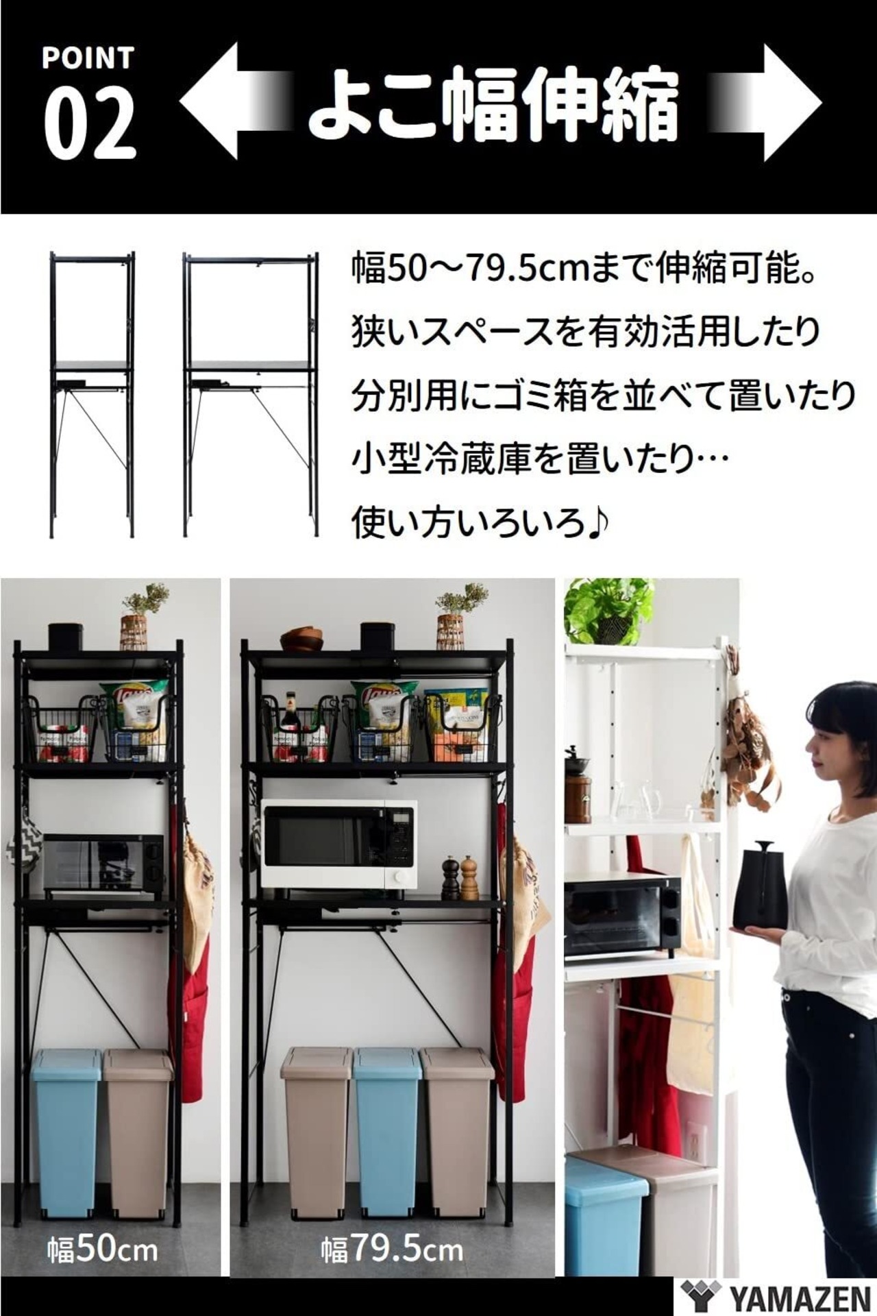 山善(YAMAZEN) レンジラック ゴミ箱上ラック (2口コンセント付き) 【全体耐荷重60kg】 幅50-79.5×奥行42×高さ170cm 棚板高さ調節可能 棚板2枚 フック4個付き レンジ台 ラック 組立品 ブラック EPE-2(BK)