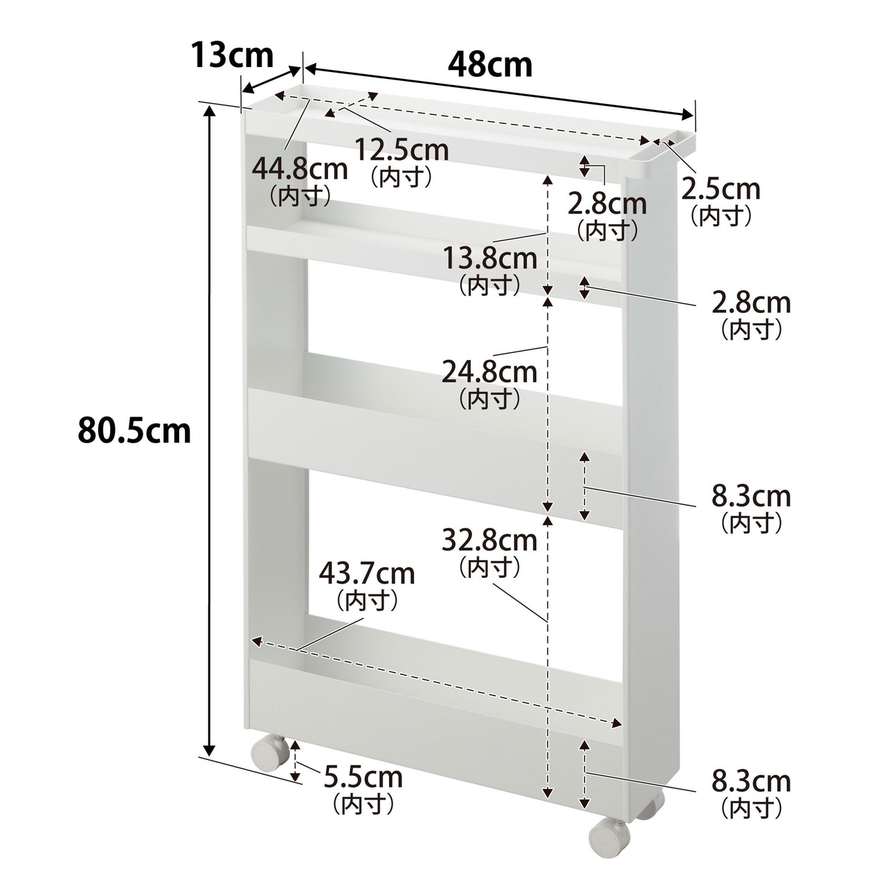 商品サイズ:W13×D48×H80.5cm(キャスター含む) ▪商品重量:約5.8kg ▪内寸 1段:W12.5×D44.8×H2.8cm 2段:W12.5×D44.8×H13.8cm 3段:W12.5×D44.8×H24.8cm 4段:W12.5×D44.8×H32.8cm