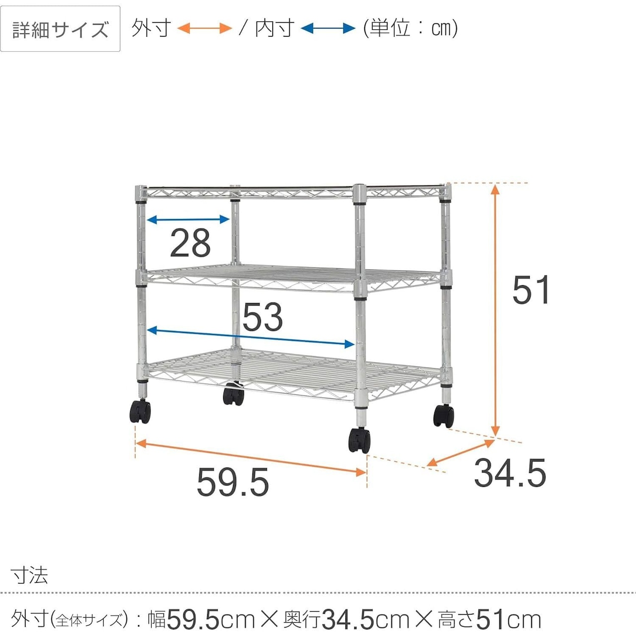 ドウシシャ メタルルミナスラック キャスター付き スチールラック幅60 3段 EL19-51603 軽量で組立簡単工具いらず 幅59.5×奥行き34.5×高さ51.0cm 棚板耐荷重80kg 全体耐荷重240kg 頑丈 防錆加工 ポール径19mmパーツ対応 キッチンラック 隙間収納
