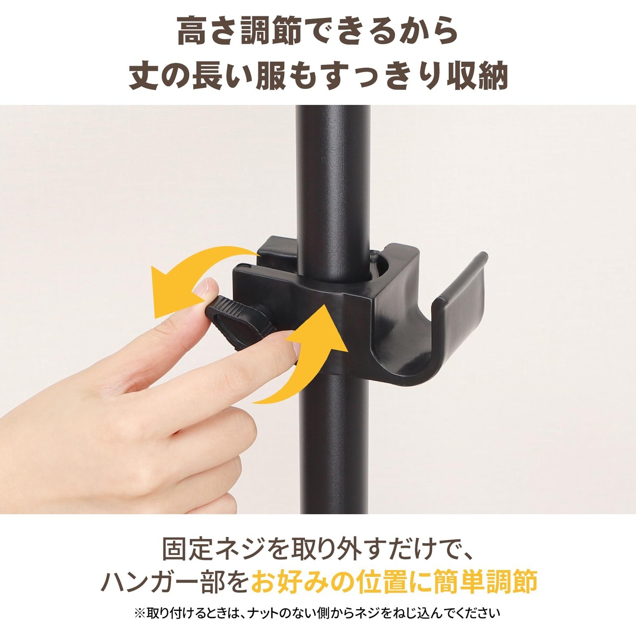 【今までになかったハンガーラック】自社開発の新モデルは安定性、安全性、耐荷重の向上により、お客様のニーズに応えます。安定性が向上し、安全性も高まり、耐荷重もアップしています。支柱には微調整ナットが付いているため、設置後もぐらつかずにしっかりと固定できます。微調整ナットを締め込む方向に回すことで圧着固定されます。横のハンガー部1本あたりの耐荷重は50kgで、最大幅 180cmで、収納目安:夏服 (約)160着 / 冬服 (約)80着。最小幅 108cm で、収納目安:夏服 約90着 / 冬服 約45着 。上下2段式の大容量なのもうれしいポイント。これにより、「つけるのが大変」、「ぐらついて外れやすかった」、「軽いものしか掛かりません」といったお悩みを解消することができます。新モデルは安定性、安全性、耐荷重の向上により、お客様のニーズに応えます。