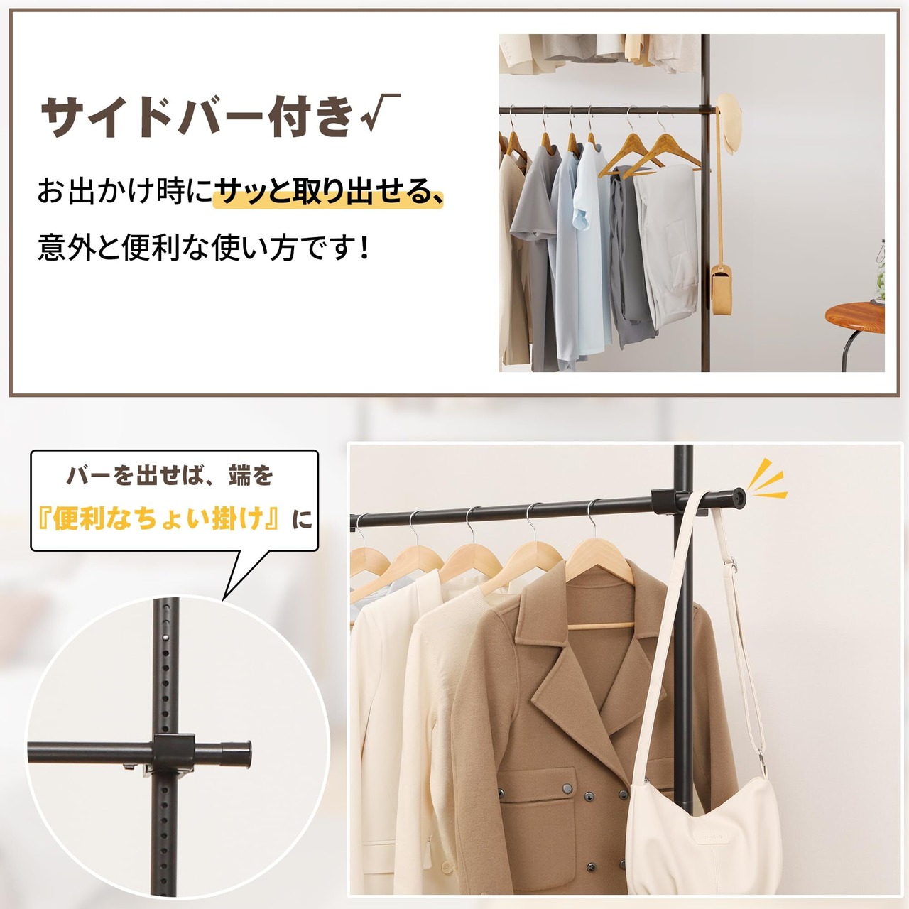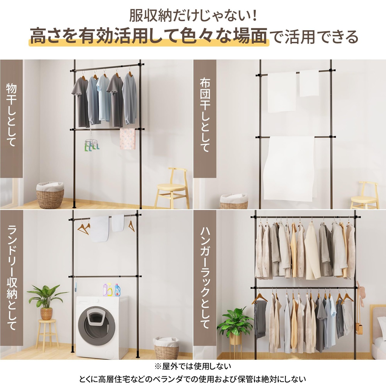 【組立・設置かんたん】ポールハンガーラックは突っ張りタイプで、高さ110-310cmまで調節可能、幅は108‐180cmまで調節可能。安定感があり、20×110cmほどのスペースがあれば設置できます。工具を使わず簡単に設置でき、突っ張り構造でカンタンに設置できます。20~25分程度で組み立てられて解体も簡単なので、組み立てが苦手な人にもうってつけです。左右の支柱がそれぞれ伸縮するので、天井の高さが違う場所にも設置できます。※設置前に説明書をよく読んでください。