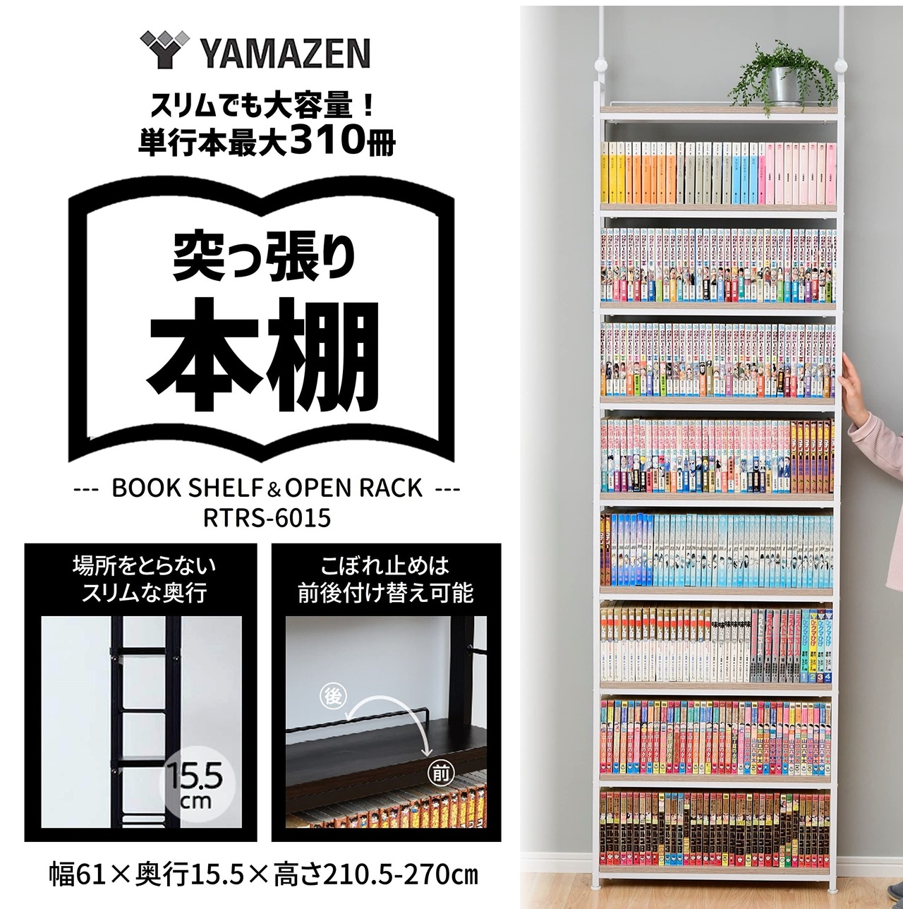 山善(YAMAZEN) 本棚 (突っ張り) 大容量 スリム 全体耐荷重180㎏ 幅61×奥行15.5×高さ210.5-270㎝ 壁面収納 ラック 組立品 アンティークアイボリー RTRS-6015(AIV/SWH)