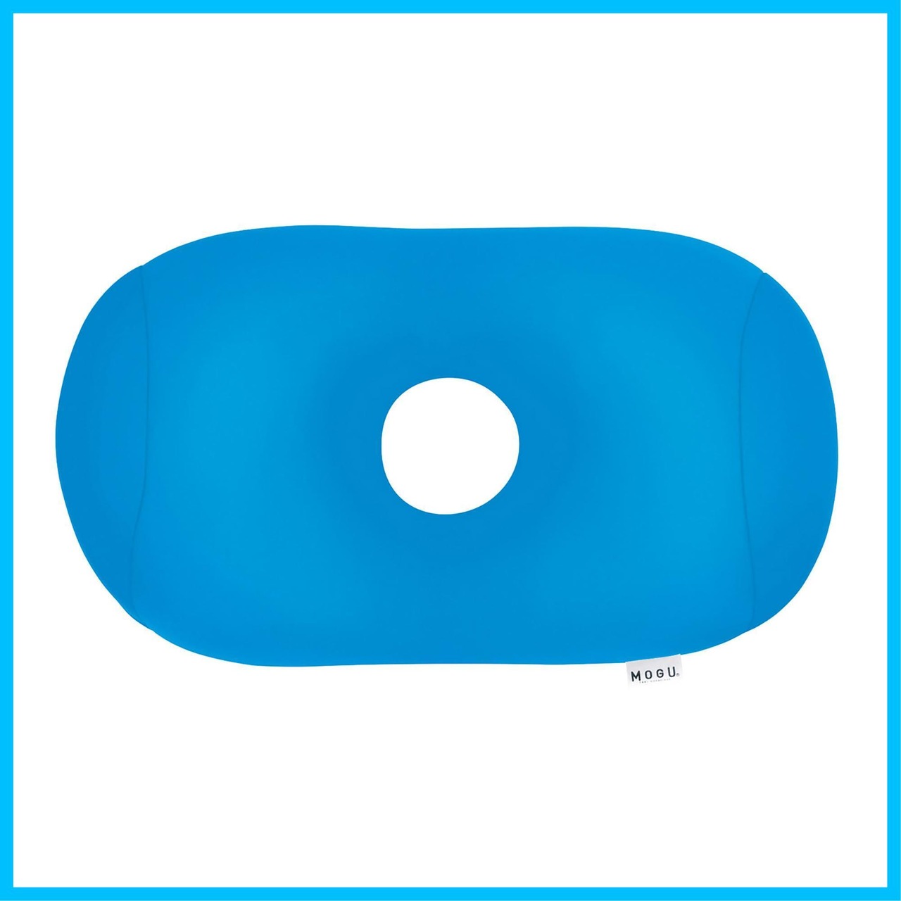 体に寄り添う「ホールピロー」;穴をあけることで、まくらに緩やかなカーブが生まれ、体の凹凸にぴったりフィット。MOGU独自の超微粒子ビーズが頭や腰、お尻を心地よく支えます。