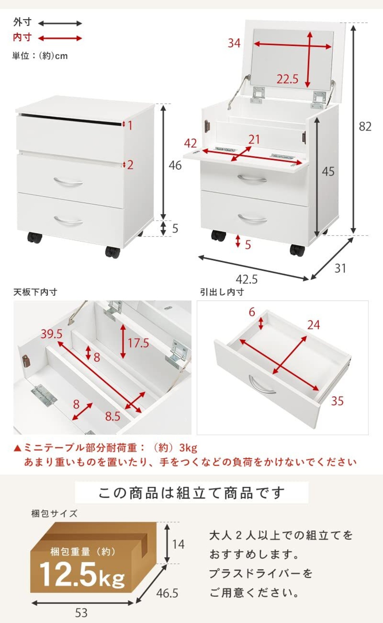 【メイクが楽しくなる機能が充実】:収納スペースは少し高さがあり、化粧水やクリーム、メイクブラシ等の収納にも最適手前の収納スペースは仕切りを倒すとミニテーブルに!メイク中の小物置きにご活用ください。