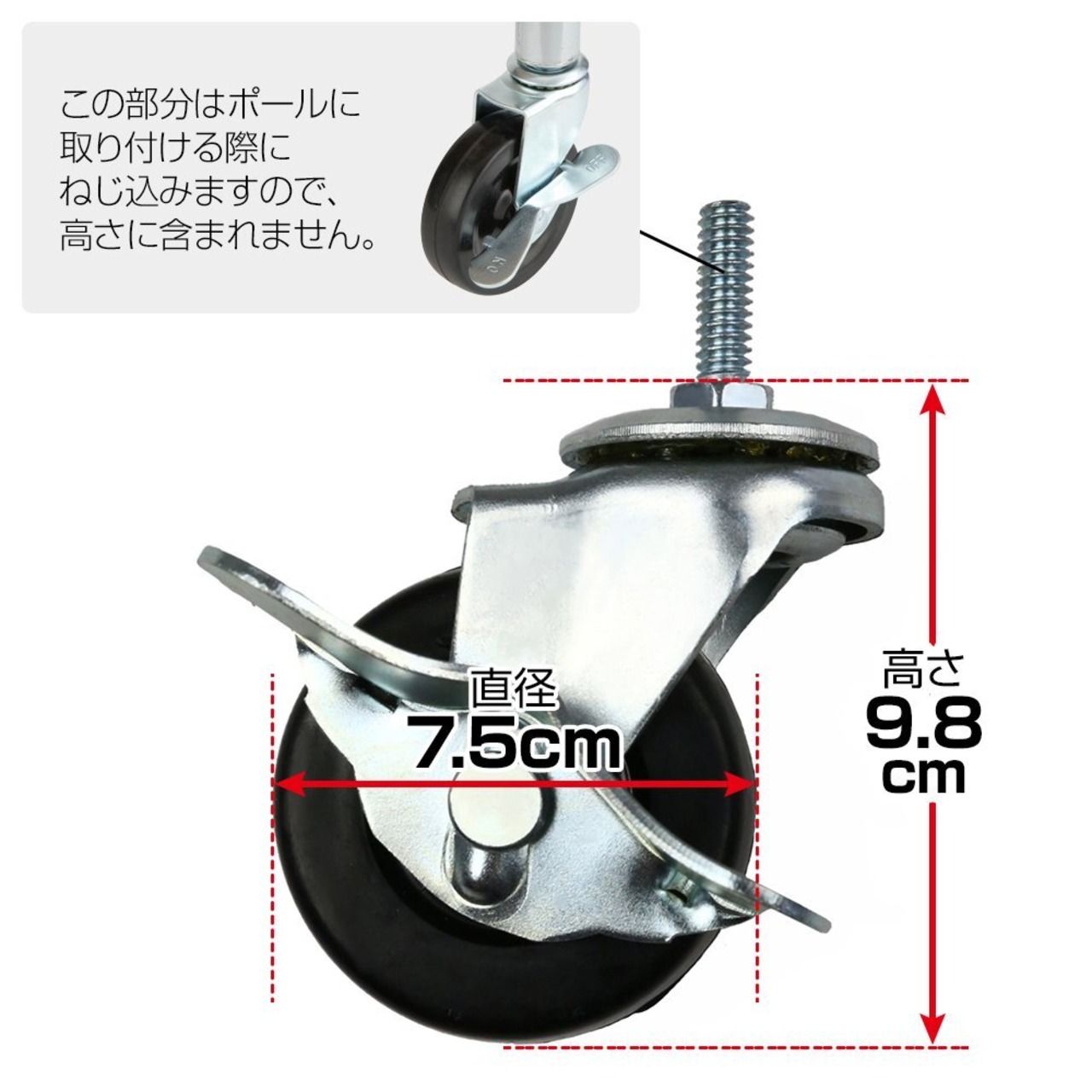 ●キャスター各種、三角プレート脚、円形アジャスターの高さサイズ表記は、ポールにねじ込むネジ切り部は含まれていません