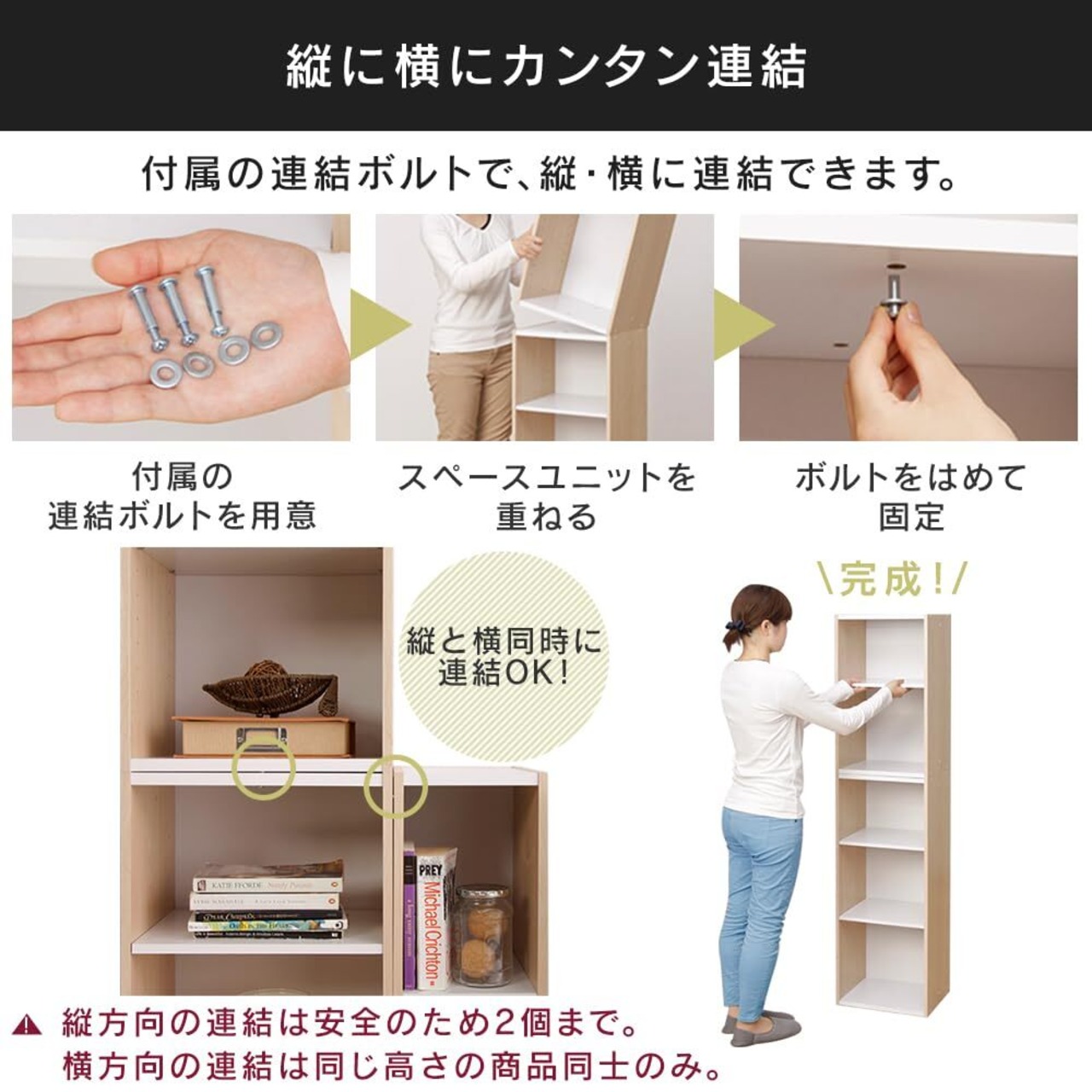 ●リビングやキッチン、洗面所のちょっとしたスペース(隙間)を有効活用することができる収納ラックです。付属の連結金具で商品同士を縦方向・横方向に組み合わせて使用できます。連結することで、様々な大きさの隙間に対応できます(安全面を考えて、縦連結は2つまでしかできません)。棚は可動棚なので、収納物に合わせて高さを調節できます(棚受けピン用の穴のピッチ間隔は約3.2cmです)。●隙間を有効活用できるラック!