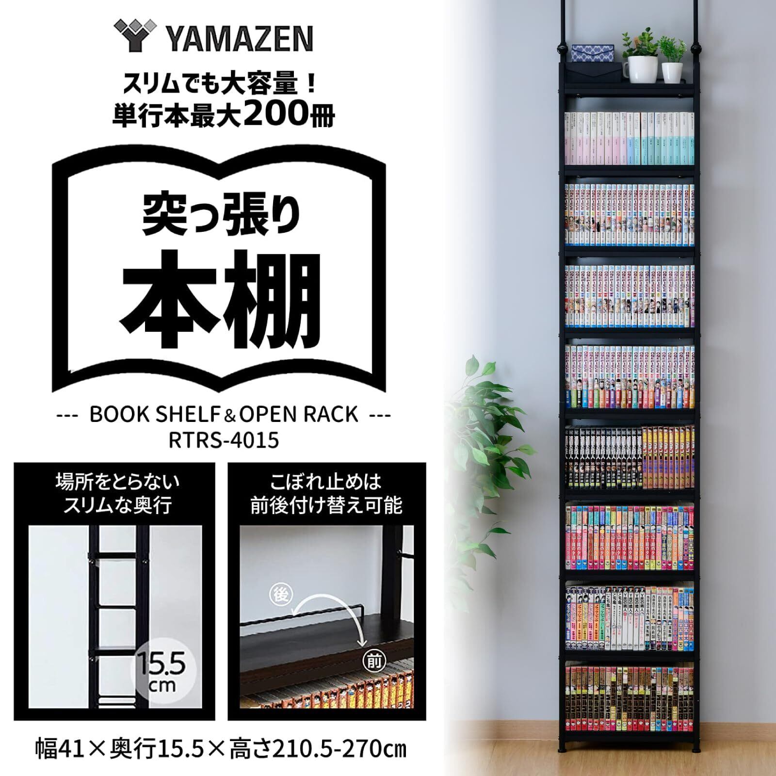 山善(YAMAZEN) 本棚 (突っ張り) 大容量 スリム 全体耐荷重180㎏ 幅41×奥行15.5×高さ210.5-270㎝ 壁面収納 ラック 組立品 ブラック RTRS-4015(BK/BK4)
