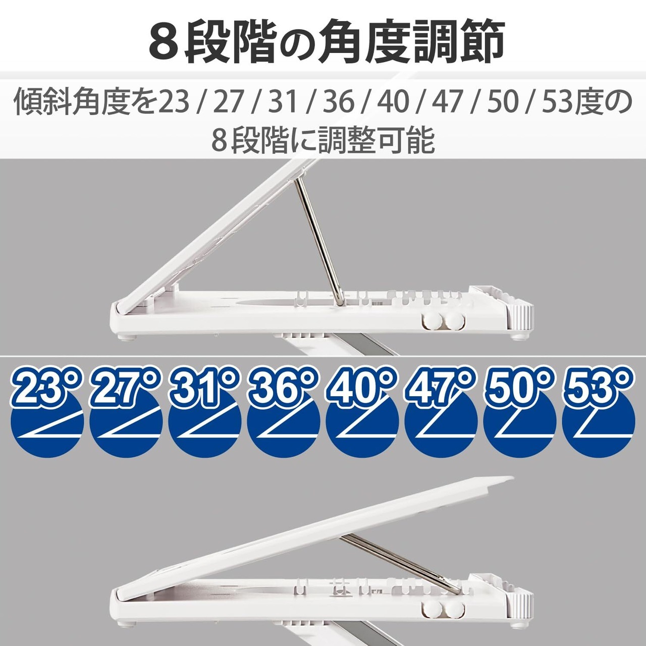 傾斜角度を23度・27度・31度・36度・40度・47度・50度・53度の8段階に調整可能です。 設置することでディスプレイを見る際の目線を上げられるため、パソコン作業の際の姿勢を改善することができます。