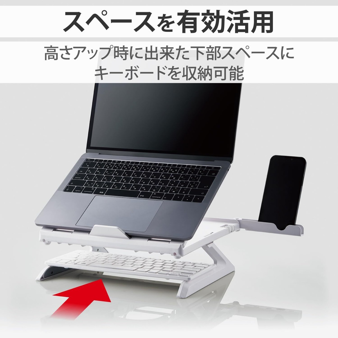 高さを9.5cmアップできる折りたたみ式の脚付です。 高さアップ脚を利用すればノートパソコンスタンドの下のスペースを有効活用でき、ノートパソコンスタンドの下のスペースにキーボードを収納することができます。