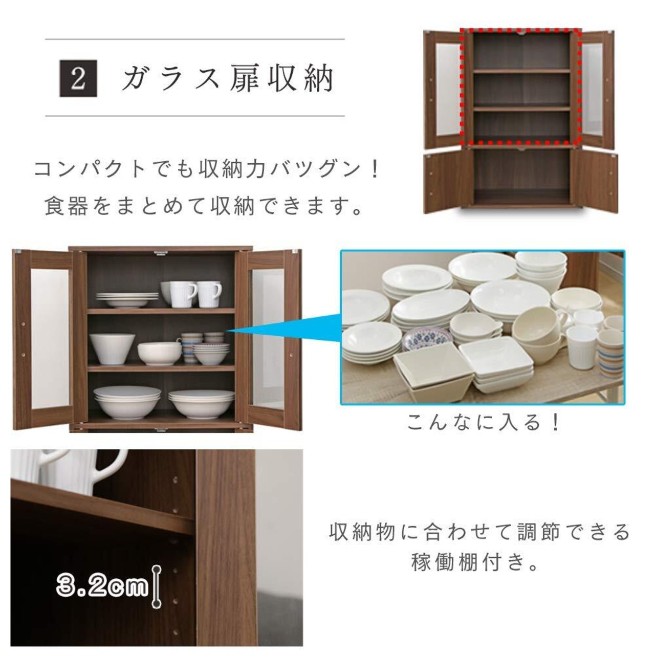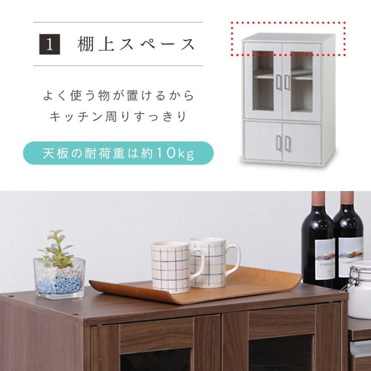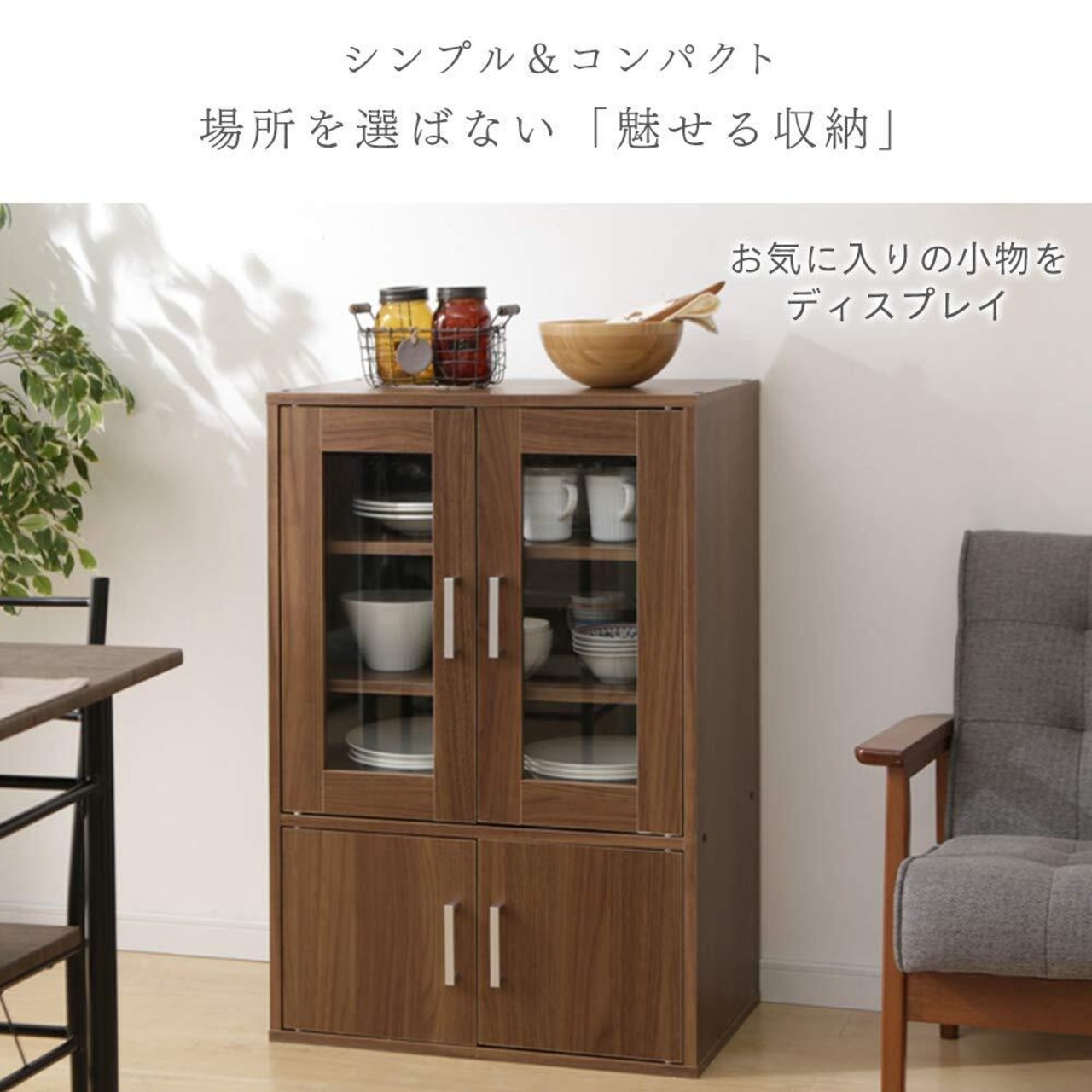 シンプル&コンパクトなデザインのガラスキャビネットです。一人暮らしのお部屋やリビング、キッチンなど、場所を選ばず使えます。お気に入りの小物をディスプレイする、「魅せる収納」にもおすすめ。雑誌や本の収納にも最適な、どんなお部屋にもなじむ落ち着いたデザイン。◇GlassCabinetのおすすめポイント◆キッチン周りがキレイに片付く、優れた収納力よく使う物や雑貨が置ける棚上スペースで、キッチン周りもすっきり。天板は奥行約39cm、耐荷重も約10kgと丈夫です。◆しっかり大容量の収納スペース食器棚コンパクトでも収納力バツグン! キッチン小物も食器もまとめてすっきり収納できます。◆ガラス扉付き収納棚お気に入りの小物や食器をディスプレイして「魅せる収納」も楽しめます。読みたい本もすぐに見つかる! ◆板扉付き収納棚板扉付きの棚に収納すれば、収納物が隠せて、見た目もすっきり。◆使いやすさを追求したこだわりの仕様収納の幅が広がる可動棚付き。2枚の可動棚は取り外し可能! 3.2cm間隔で高さを調節でき、置くものの高さに合わせて位置を変えられます。◆選べる3カラー・Walnut(ウォールナット) お部屋を落ち着いた雰囲気に。 カフェテイストやヴィンテージテイストなど、シックなコーディネートにおすすめ。・Natural(ナチュラル) 美しい木目とやわらかな木の風合いが、お部屋を温かみのあるやさしい印象に。 北欧テイストのコーディネートにおすすめ。・Off-White(オフホワイト) どんなお部屋とも相性がいい万能カラーで、お部屋をすっきり明るい印象に。 清潔感があるので、キッチンにもおすすめ。※お客様組立商品です(工具はお客様にてご用意ください)