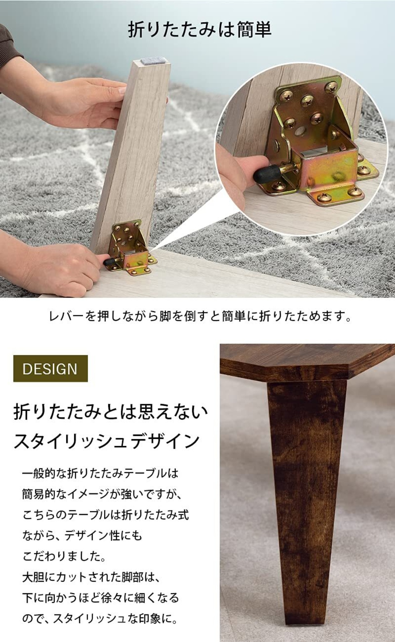 リアルな古木調と八角形の天板がスタイリッシュな折りたたみテーブル。〈br〉コンパクトなので一人暮らしなどのワンルームや狭いお部屋、子供部屋などにおすすめ。〈br〉折りたたむとソファ下やちょっとした隙間に収納できるので、来客時のサブテーブルやリモートワーク、リモート授業専用のテーブルとしても活躍します。