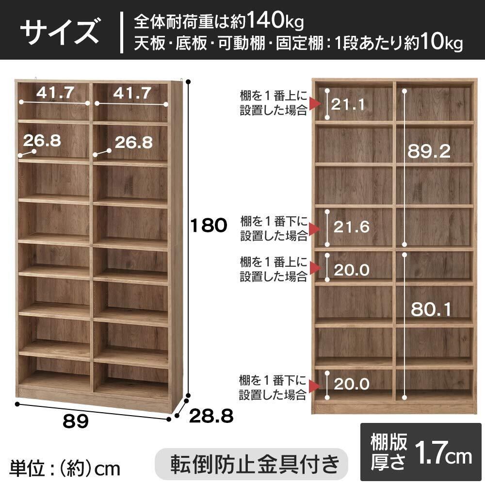 商品サイズ(cm):幅約89×奥行約28.8×高さ約180.0耐荷重/可動棚板1枚あたり:約10kg、固定棚板:約10kg、底板:約10kg、全体:約140kg耐荷重は測定値であり、値ではありません。主要材質:プリント紙化粧パーティクルボード、プリント紙化粧繊維板(MDF)必要工具:+ドライバー(サイズ:2番)二人での組み立てをおすすめします。
