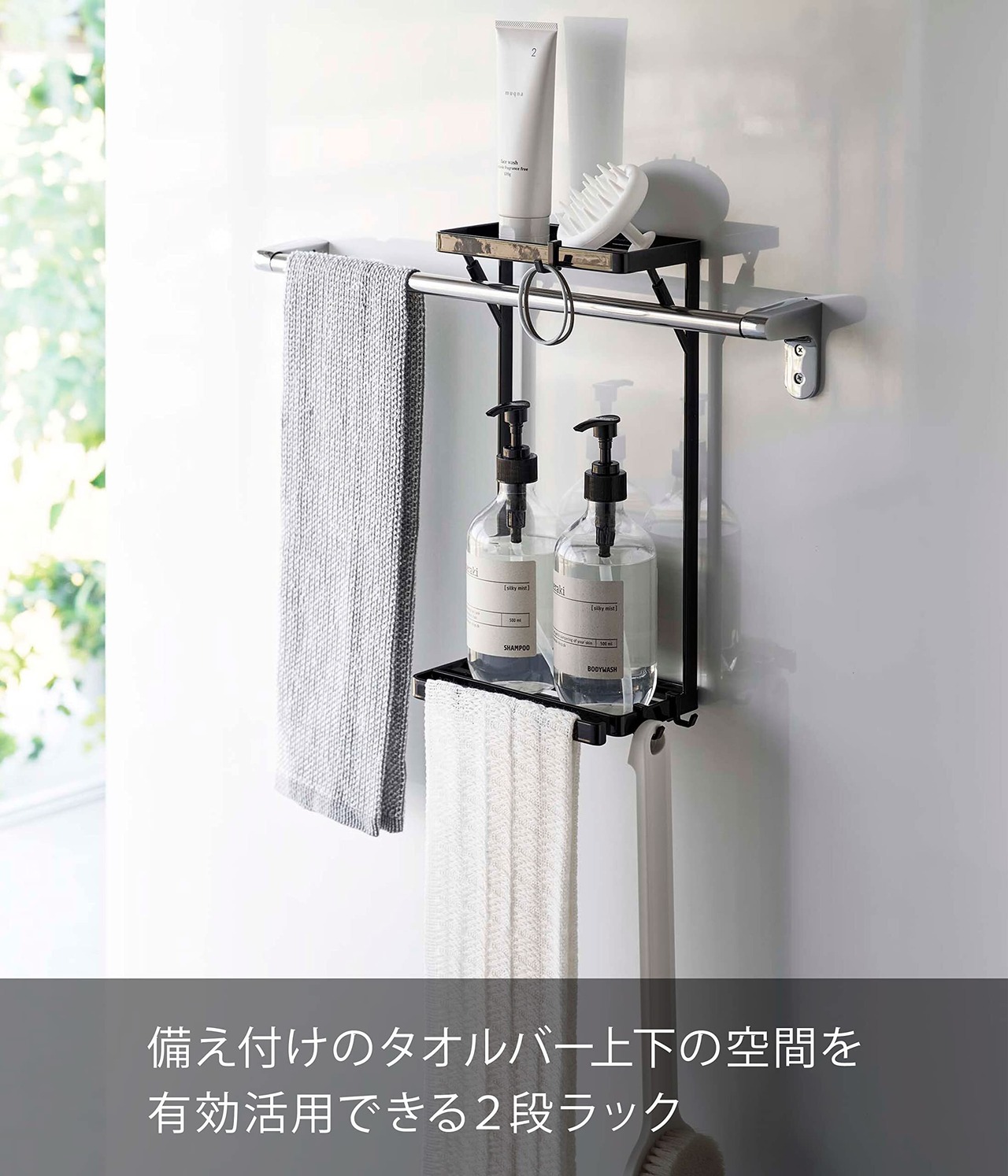 備え付けのタオルバー上下の空間を有効活用できる2 段のラック。