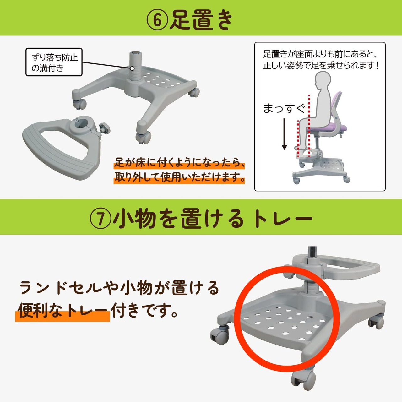 【足置き】6段階で調節でき、取り外しも可能です。足置きは座面より前にあるので、正しい姿勢で脚をまっすぐのせられます。