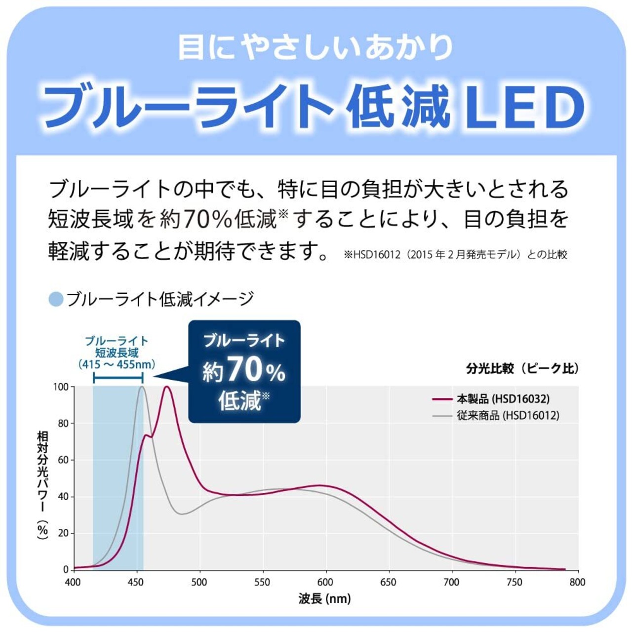 目にやさしいあかり「ブルーライト低減LED」を搭載<br>当社のLEDスタンドは、高い演色性を確保した上で、ブルーライトを約70%低減したLEDを搭載した目にやさしいスタンドです。ブルーライトの中でも特に目に負担が大きいとされる短波長域 (415~455nm) を、従来商品※1比で約70%低減しました。 ブルーライトとは、波長の短い青色の光で人が見える光(可視光線)の中でも紫外線に一番近い波長域で、目の奥の網膜まで届く高エネルギーの光であり、目に対する負担が懸念されています。スタンド使用時は光源と目の距離が近く、また長時間使用するケースが想定されるため、ブルーライト低減により網膜へのダメージを抑えることで、目の疲れや痛みなどを軽減することが期待できます。