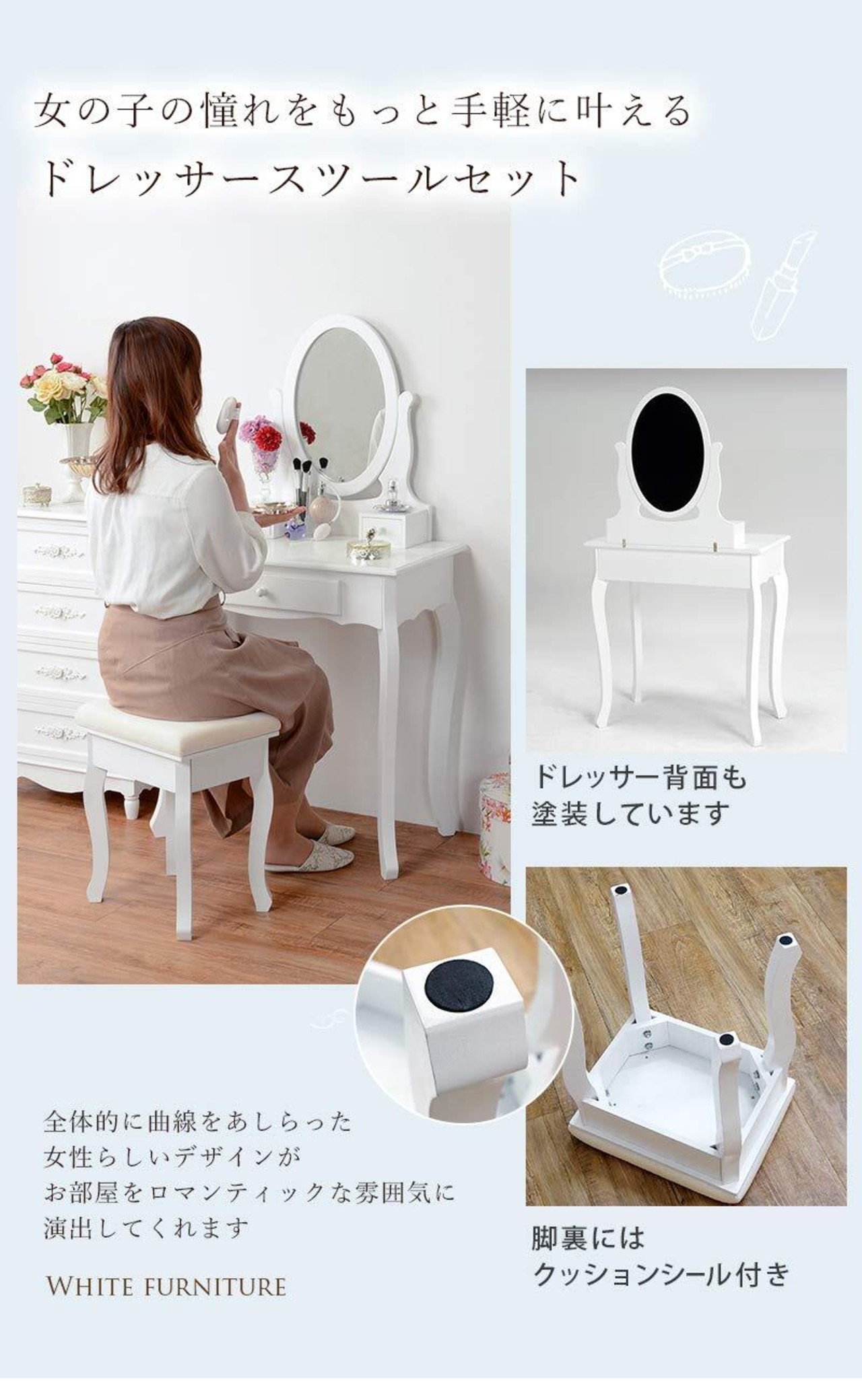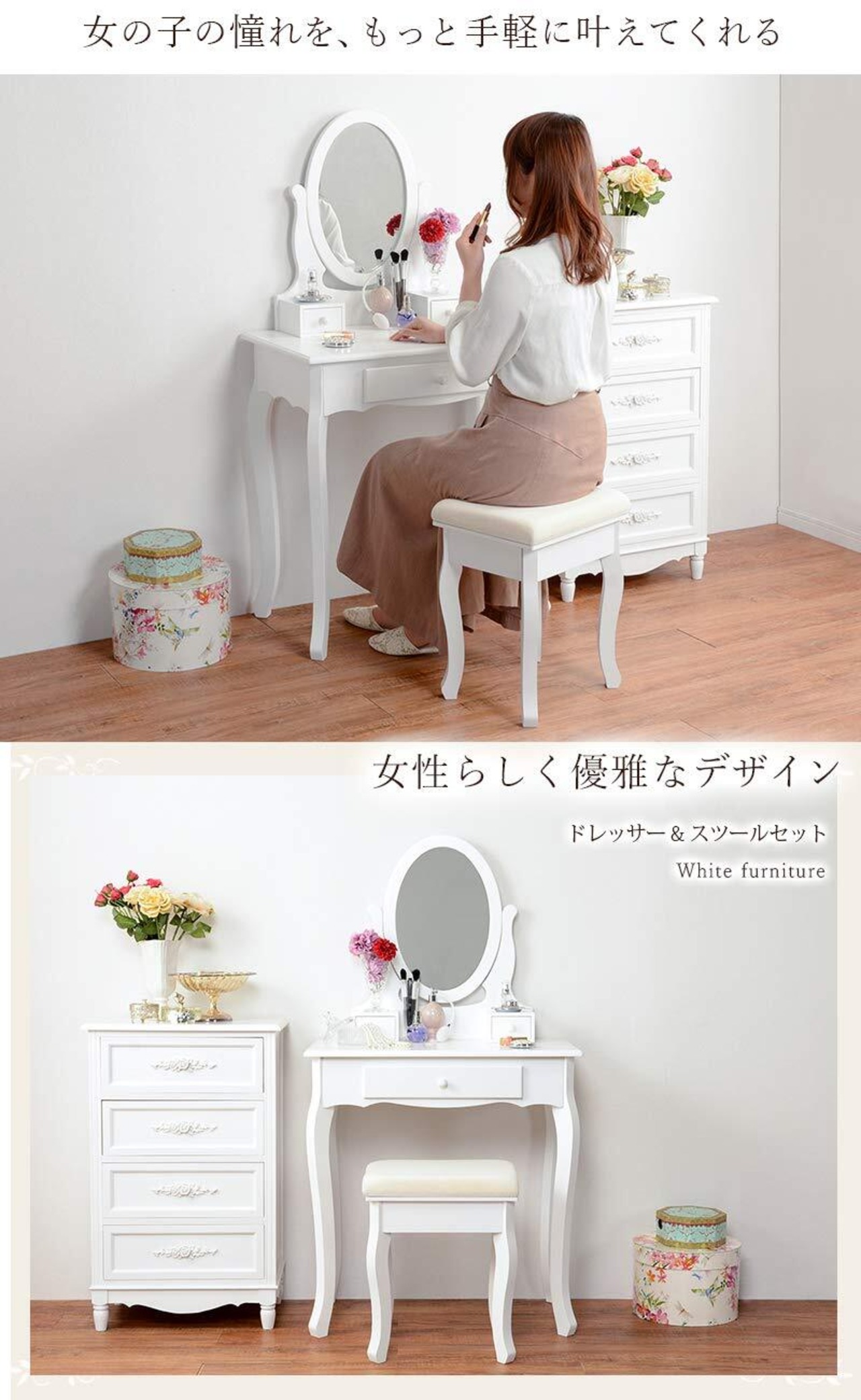 女性らしく優雅なフォルムがロマンティックなお部屋にしてくれるドレッサー。 小さな頃からの憧れを形にしたようなデザインは、メイクの度に気分が上がります。 コンパクトなサイズなので一人暮らしやワンルームの方におすすめ。 ■サイズ: 【本体】(約)幅70×奥行40×高さ130cm 【スツール】(約)幅37×奥行29×高さ45cm 【ミラー】(約)横26×縦39cm ※サイズは目安になります。 ■素材:MDF ■お客様組立品