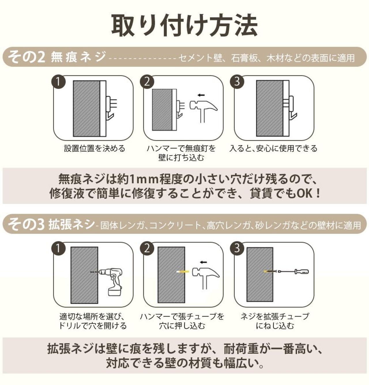 【壁を傷つけず簡単設置!選べる3つの取り付け方法】壁を傷つけることなく、簡単に取り付けられる3つの取り付け方法を備えたウォールシェルフです。粘着フック、無痕ネジ、拡張ネジの3種類の取り付け方法から選べるため、賃貸住宅や、壁に穴を開けたくない場所でも安心して設置が可能です。壁を傷つけず、しっかり固定できる点がオゥールシェルフの大きな魅力です。