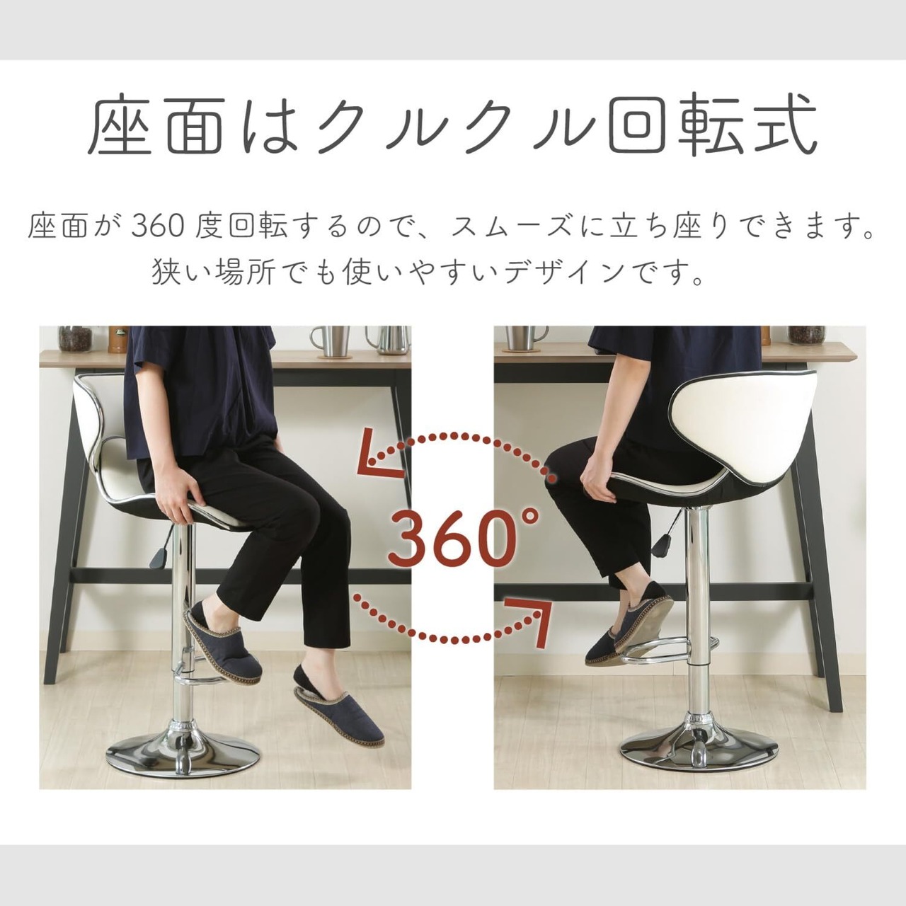 不二貿易 カウンターチェア ハイチェア 幅45.5×奥行き54×高さ88.5~109.5cm ホワイト ダイニング キッチン 360度回転 昇降式 合皮 シェル 80915