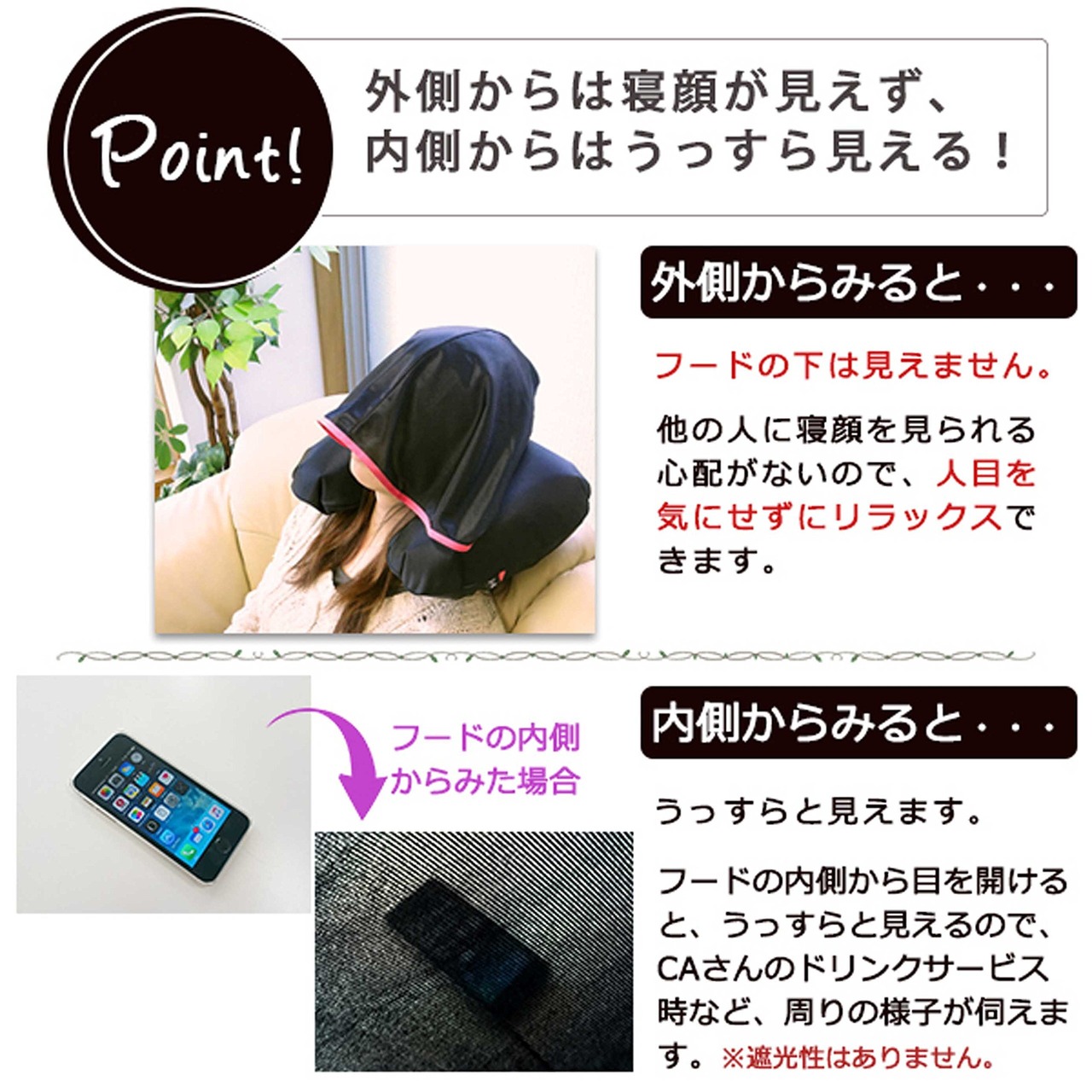 ※外からは見えない素材ですが、遮光素材ではありません。 明るさが気になる場合にはアイマスクを着用ください。