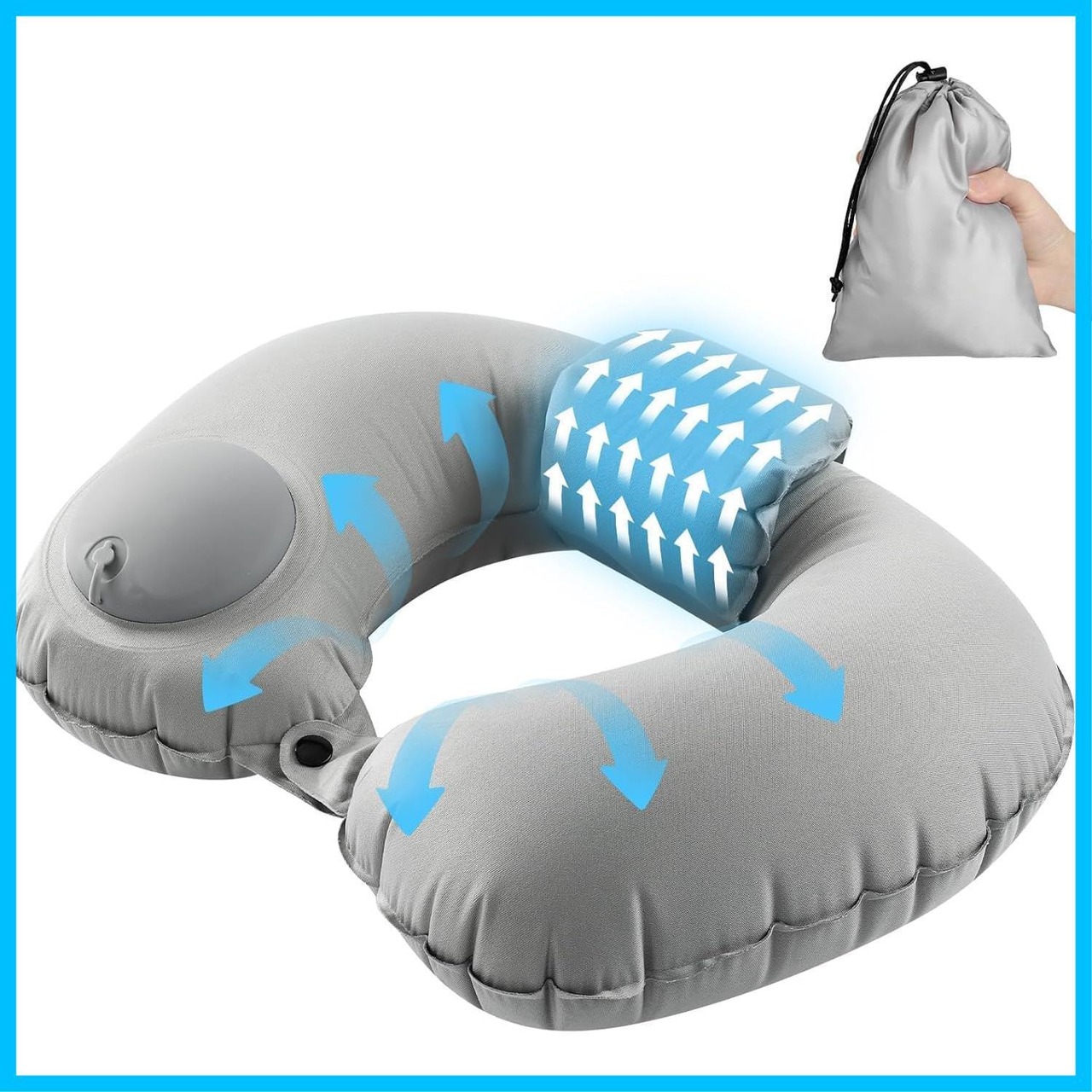 Kopeme ネックピロー ポンプ式 U型まくら ダブルバルブ 携帯枕 【ヘッドレスト付き】首枕 エアーピロー くびまくら 手動プレス式膨らませる ねっくぴロー 飛行機 旅行枕 収納ポーチ付き(グレー)