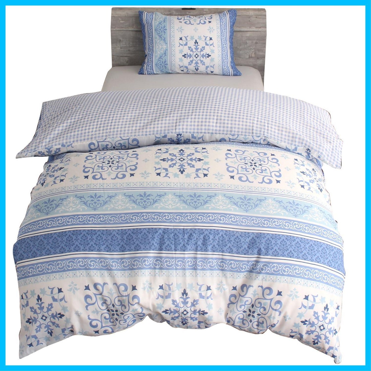 メリーナイト 掛布団カバー 「エスニック/ギンガムチェック」 サックスブルー シングルロング 約150×210cm リバーシブル仕様 両面使える 内側スナップボタン8カ所付き 着脱簡単 綿混素材 速乾 シワになりにくい 洗える 衛生 清潔 オールシーズン MN12153-76