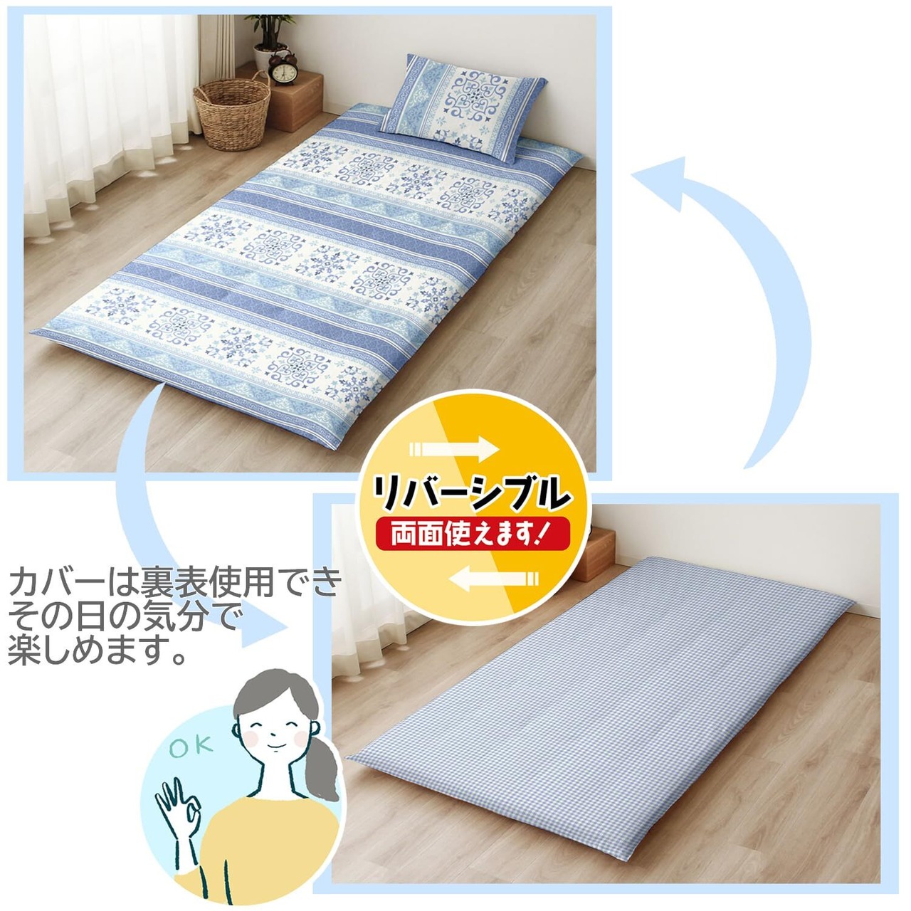 カバーは両面使えるリバーシブル仕様。別売りの枕カバー、掛布団カバーとの組み合わせで様々なカラーコーディネートも楽しめます。