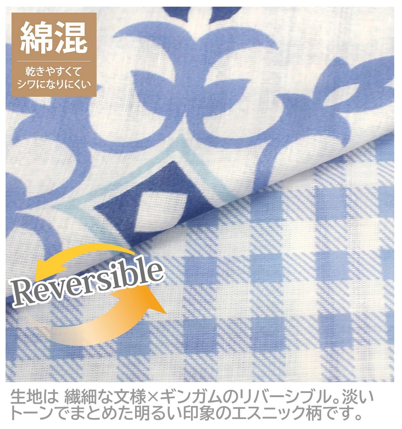 表面:エスニック柄 / 裏面:ギンガムチェック柄 違う柄のプリントで2つの柄が楽しめる。