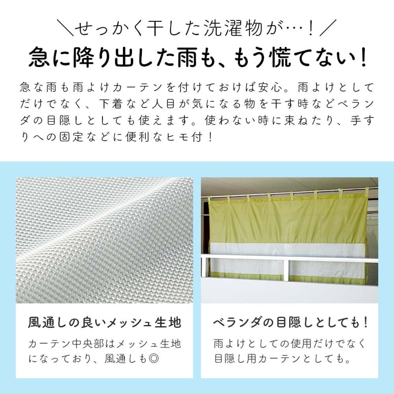 【急に降り出した雨も、もう慌てない】せっかく干した洗濯物が…! 急な雨も雨よけカーテンを付けておけば安心。雨よけとしてだけでなく、下着など人目が気になる物を干す時などベランダの目隠しとしても使えます。使わない時に束ねたり、手すりへの固定などに便利なヒモ付!