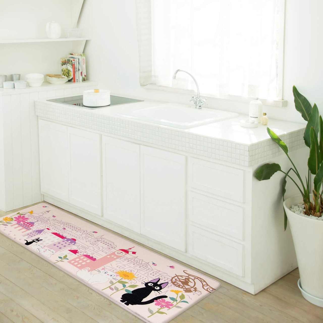 映画に登場の猫たちが花咲く街並みで佇むデザインと薄いピンクが上品さを演出するマット。「花のまち」のイラストと、ジジ、ジジの恋人リリー、子ども達が描かれています。水に強く、水ハネや油汚れもサッとひと拭きするだけのPVC(ポリ塩化ビニル樹脂)なので、お洗濯いらずでお手入れかんたん。程良い厚みで床を傷つけにくく足への負担も軽減されます。