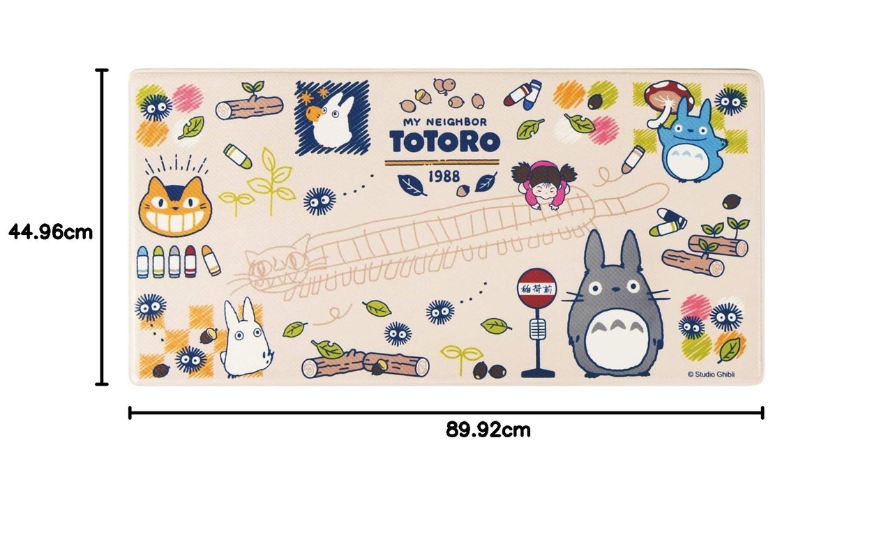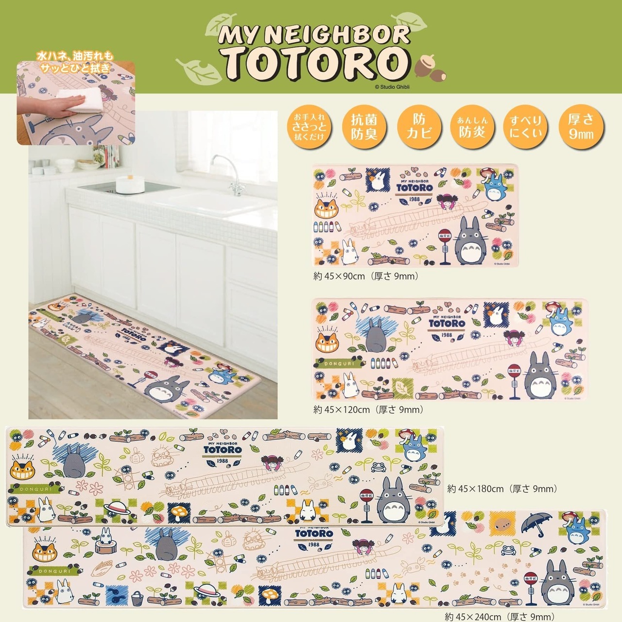 映画のエンディングロールシーンを切り取ったシーンや特徴的なポーズのトトロのカットを集めた楽しいデザインのマット。水に強く、水ハネや油汚れもサッとひと拭きするだけのPVC(ポリ塩化ビニル樹脂)なので、お洗濯いらずでお手入れかんたん。程良い厚みで床を傷つけにくく足への負担も軽減されます。