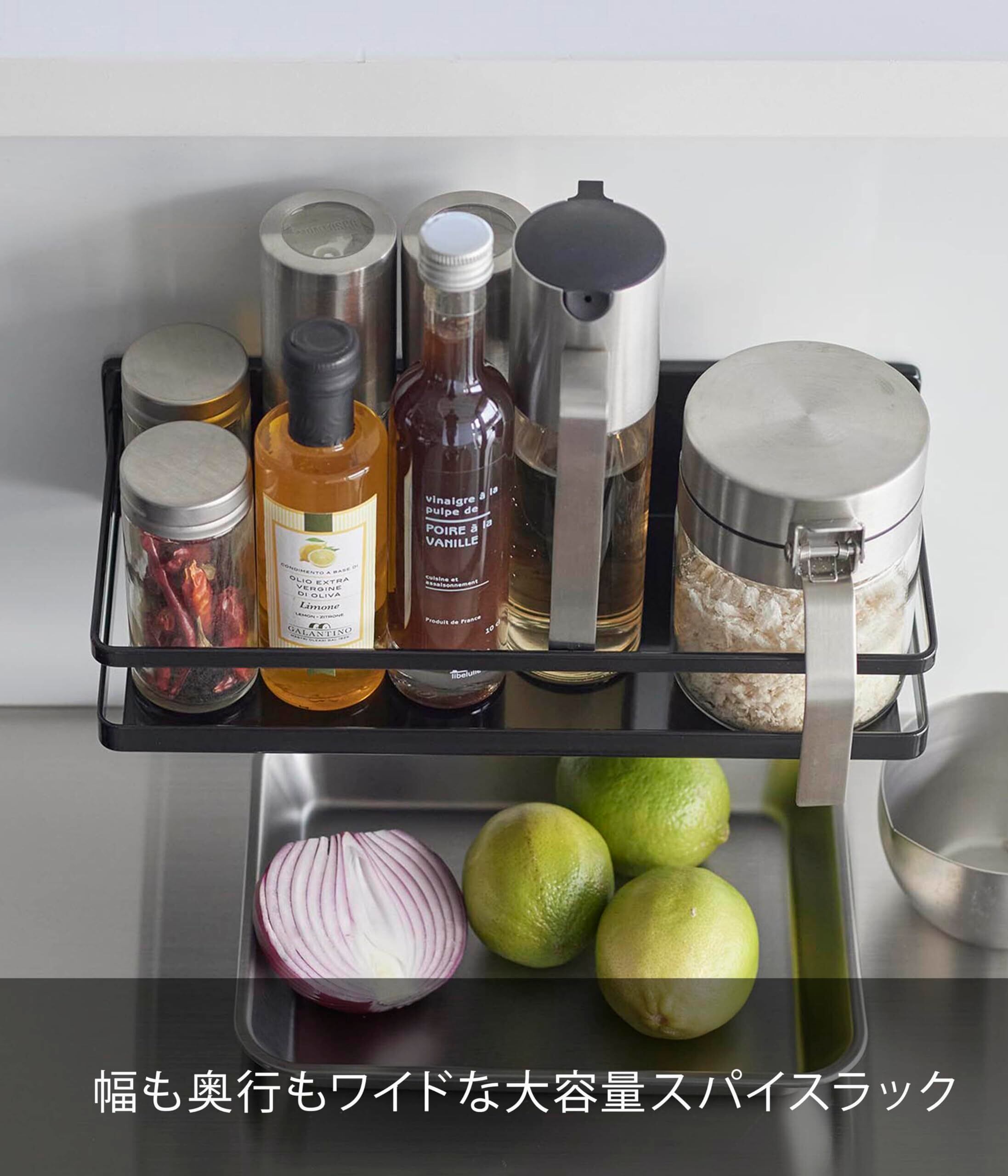 フィルムフックでキッチンパネルや冷蔵庫扉に簡単取り付け!幅も奥行もワイドな大容量スパイスラック。