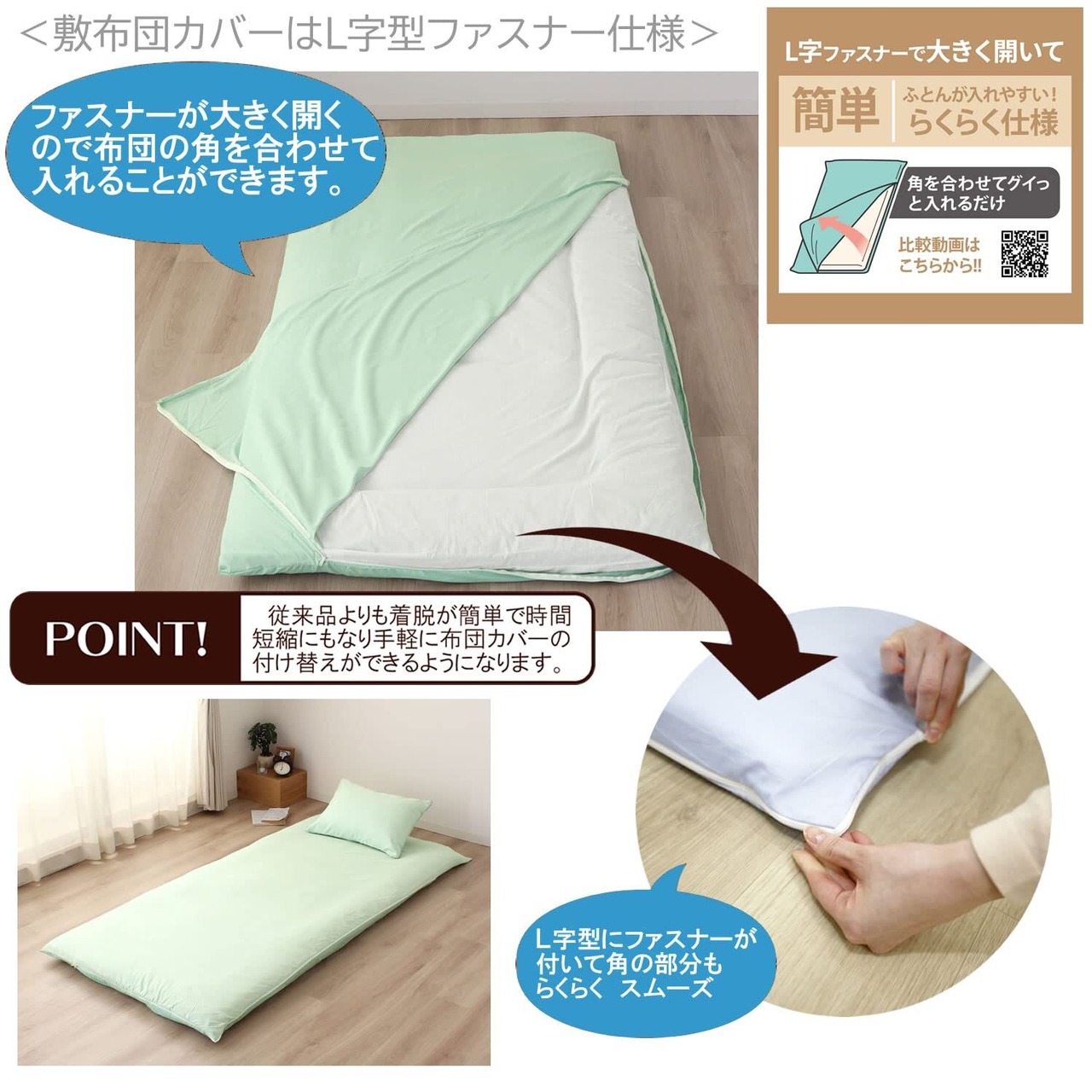 「速乾」「シワになりにくい」「L字ファスナー」が特長の取り扱いがしやすい敷布団カバー。L字型にファスナーがついている為、カバーの角が開き 敷布団の出し入れがしやすく 従来品よりも着脱が簡単になり めんどうな布団カバーの取り外しも楽になります。取り扱いがしやすいのも日常使いのアイテムには大切なポイントです。