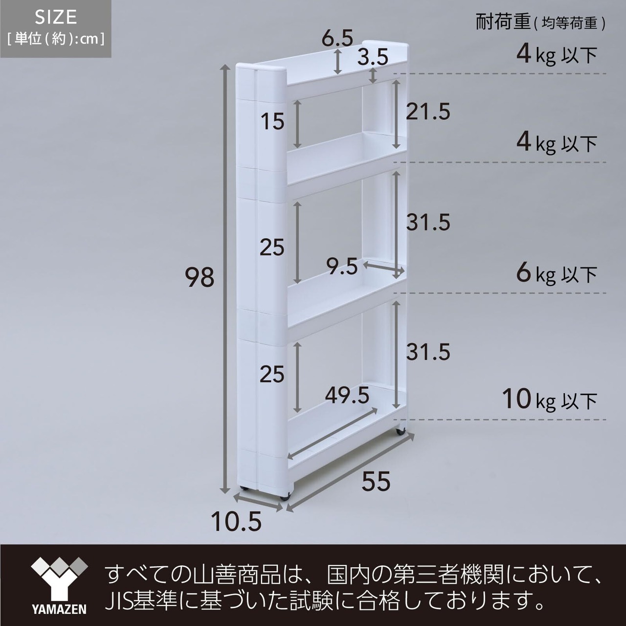 ●本体サイズ(約) : 幅10.5×奥行55×高さ98cm●カゴ内寸 : 幅9.5×奥行49.5×高さ6.5/3.5cm(カゴの壁が一方は高く、もう一方は低くなっています。)●内寸高さ : 上/21.5 中/31.5 下/31.5cm●耐荷重(均等荷重) : 棚板(上段)/4kg以下、棚板(中段 上)/4kg以下、棚板(中段 下)/6kg以下、棚板(下段)/10kg以下●材質 : ポリプロピレン●東証プライム(株)山善で扱うすべての山善商品は、自社もしくは第三者機関において、JIS規格に基づいた品質試験を行っております。