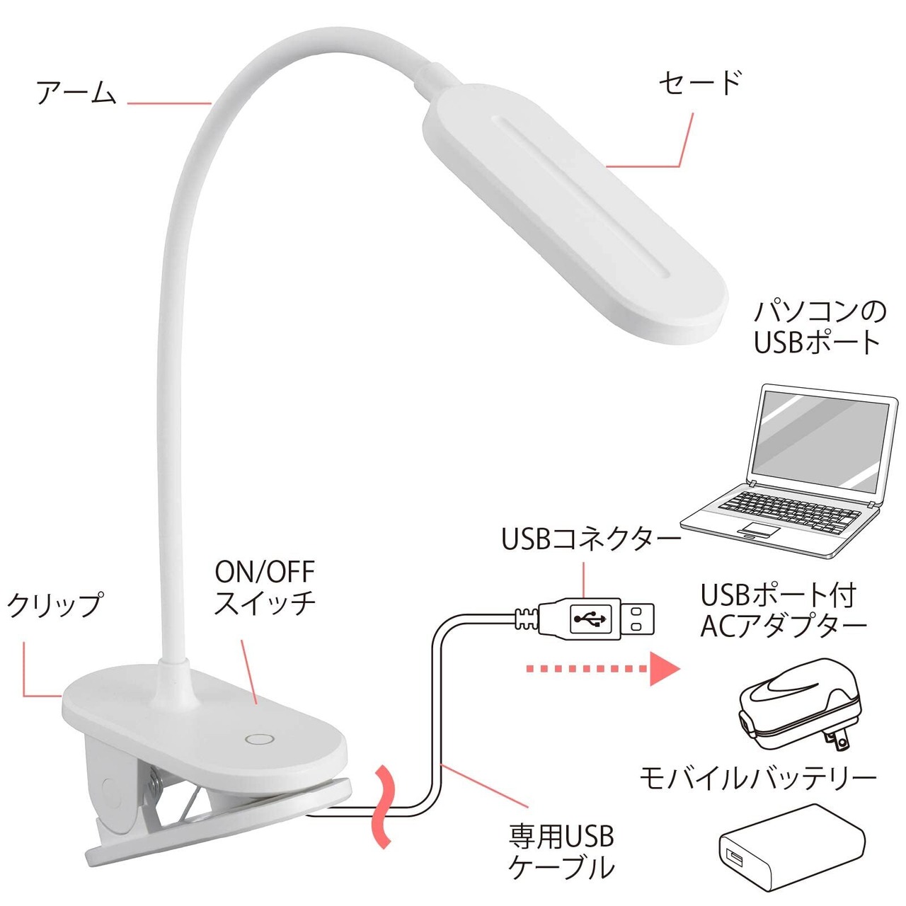 色:昼白色 【 特 長 】● 読書や学習におすすめ● スイッチがベースにありON/OFFしやすい● LED一体型● セードの向きが自由に調整できるフレキシブルアーム● 照度約1000ルクス(直下25cmで点灯時)、全光束約160ルーメンの明るさ● USB電源(ACアダプター別売)● 屋内用● 昼白色【 仕 様 】■ 消費電力:約2.8W■ 電源:出力5V 1A 以上のUSBポート■ 光源:LED×12灯(交換不可)/昼白色■ 照度:約1000ルクス(直下25cmで点灯時)■ 全光束:約160ルーメン■ クリップ取付可能厚:15mm以上35mm以下■ 本体寸法: セード…(約)幅42×高さ10×奥行125mm アーム…約300mm クリップ…(約)幅58×高さ50×奥行120mm■ ケーブル長:約80cm■ 質量:約165g■ 付属品:書付取扱説明書≪ご注意≫※ 出力が5V 1A未満のUSB電源を使用すると、点灯状態が不安定になることがあります。