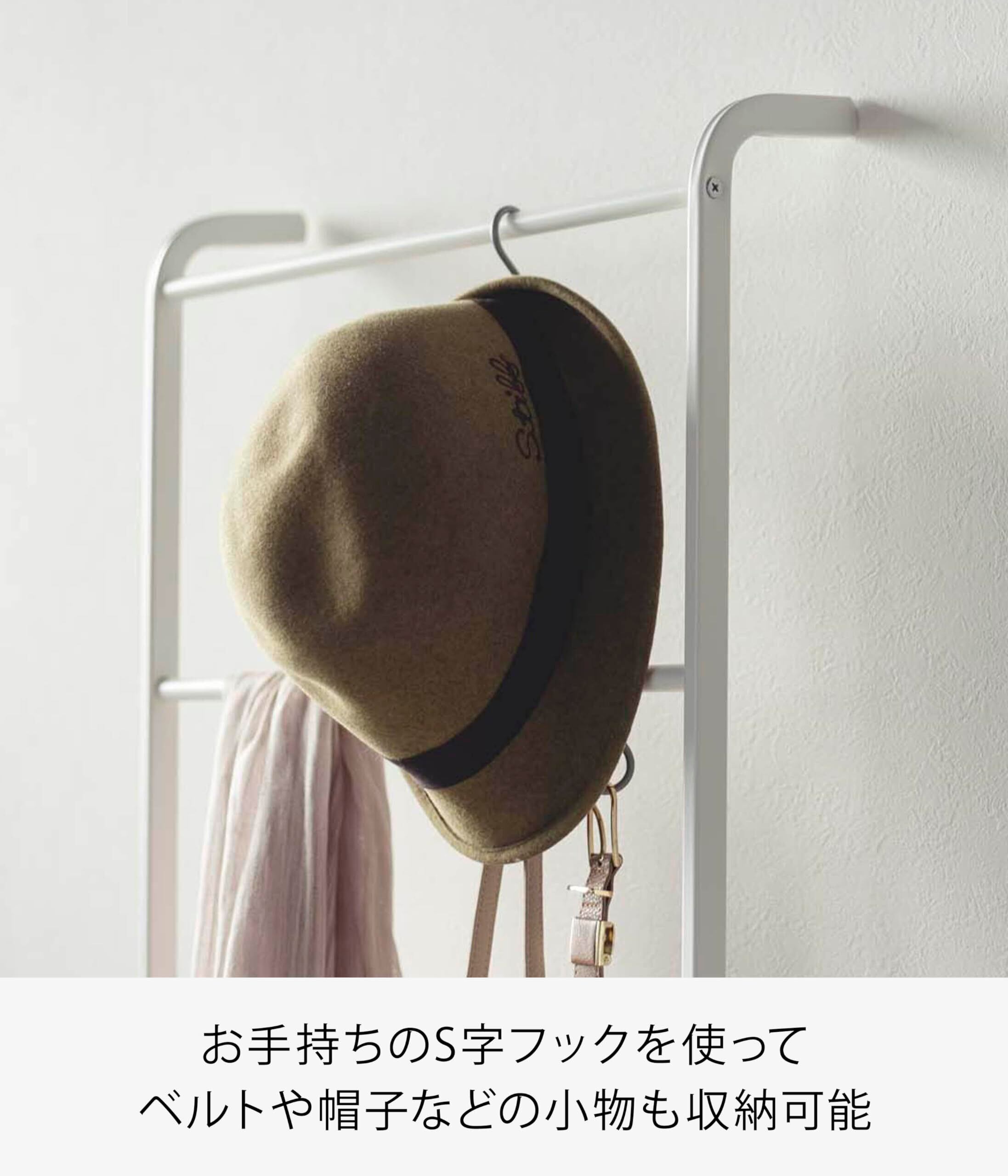 S字フックを使えば、ベルトや帽子 などの小物も収納可能。