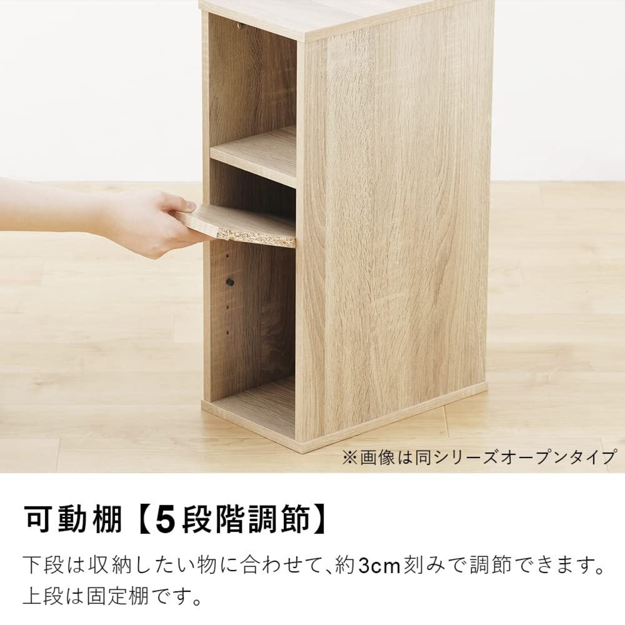 下棚は約3.2cm間隔で、5段階調整可能な可動棚になっているので、収納物に合わせて自由に調整できます。