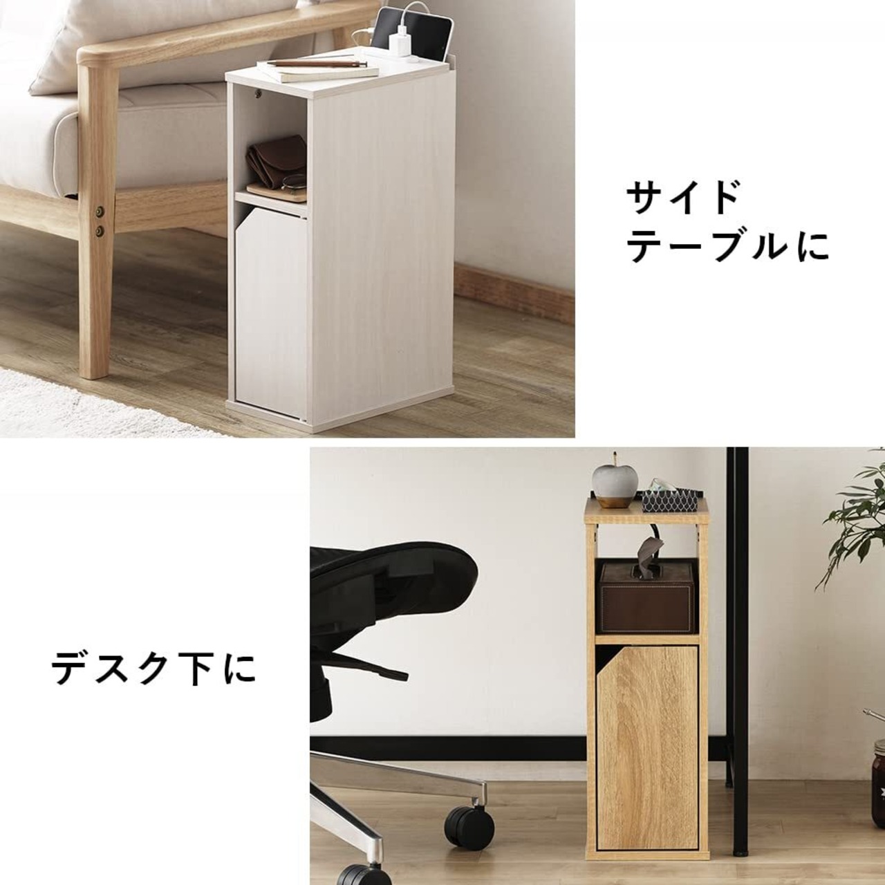 ベッドサイドやソファの横、デスク下などに置けるコンパクトなサイズです。