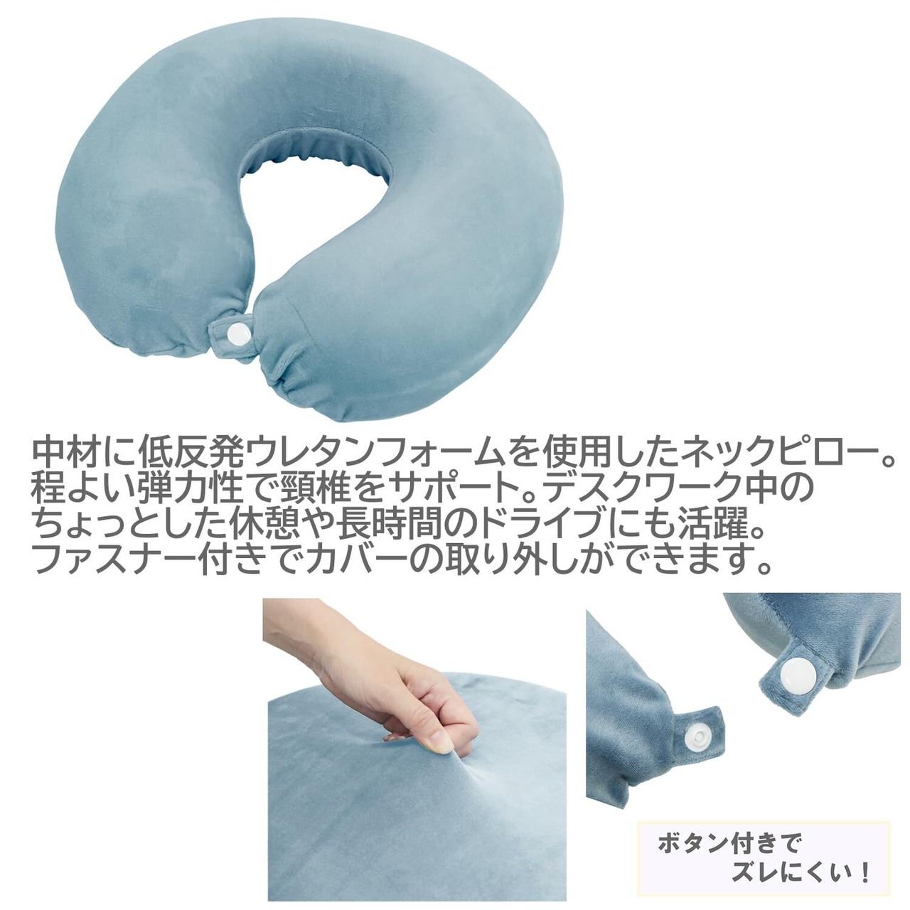 中材に低反発ウレタンフォームを使用したネックピロー。程よい弾力性で頸椎をサポート。デスクワーク中のちょっとした休憩や長時間のドライブにも活躍。首元にボタン付き、使用中にズレにくくなっています。持ち運びに便利なコンパクトサイズ。ファスナー付きでカバーの取り外しができます。カバーは洗濯可能。整髪剤やメイクのうつりなど…汚れが気になる時 洗えて清潔に使用できます。