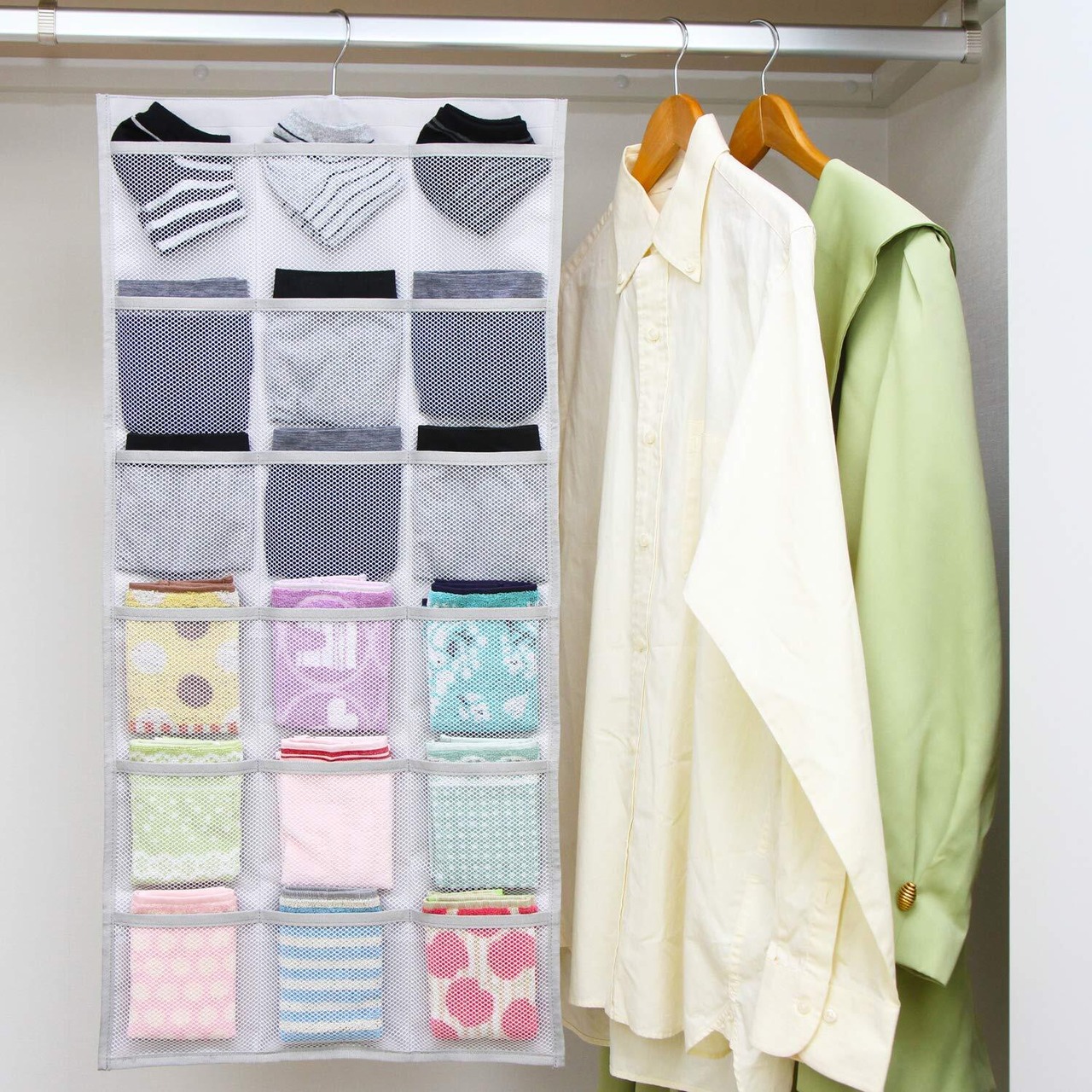 【スペースを有効活用】:ポケット部分はメッシュ生地で通気性が良く、スリムなのでクローゼットの隙間にも吊り下げられる。