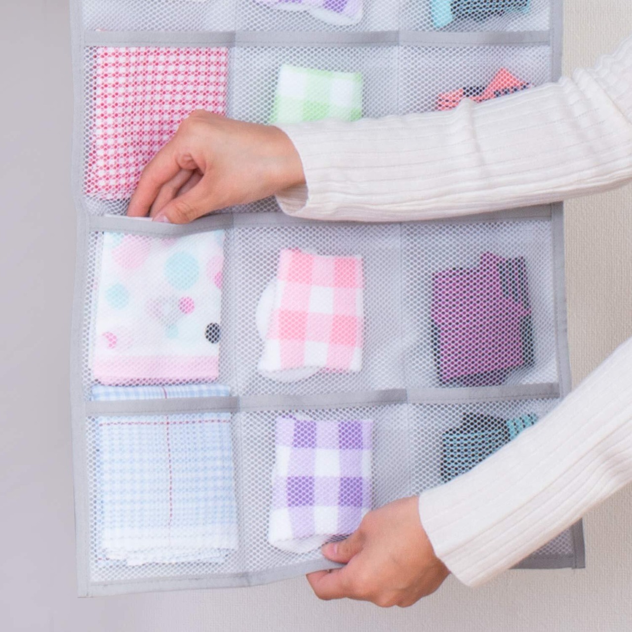 ●ポケット部分はメッシュ生地で通気性が良く、スリムなのでクローゼットの隙間にも吊り下げられる。