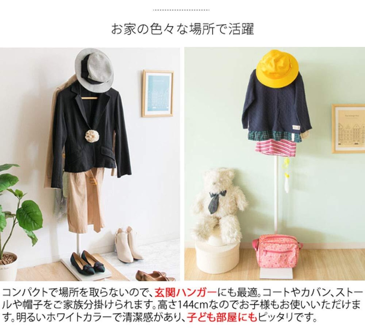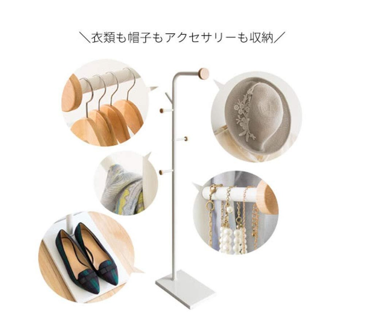 バー先端には帽子が掛けられ、支柱は背面やサイドにストールやアクセサリーが掛けられるフック付き